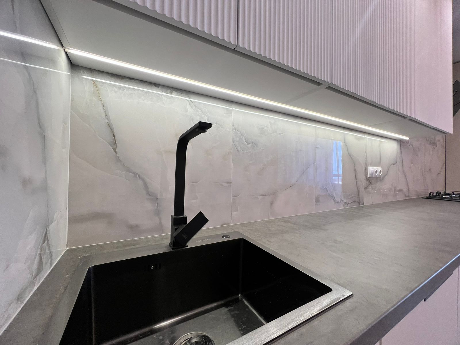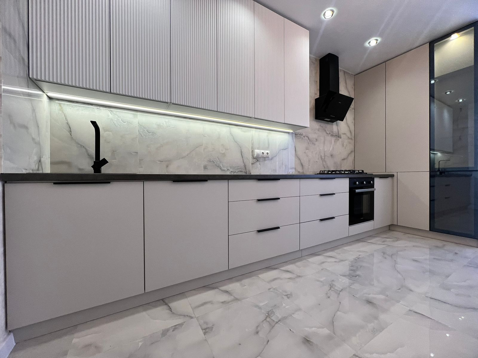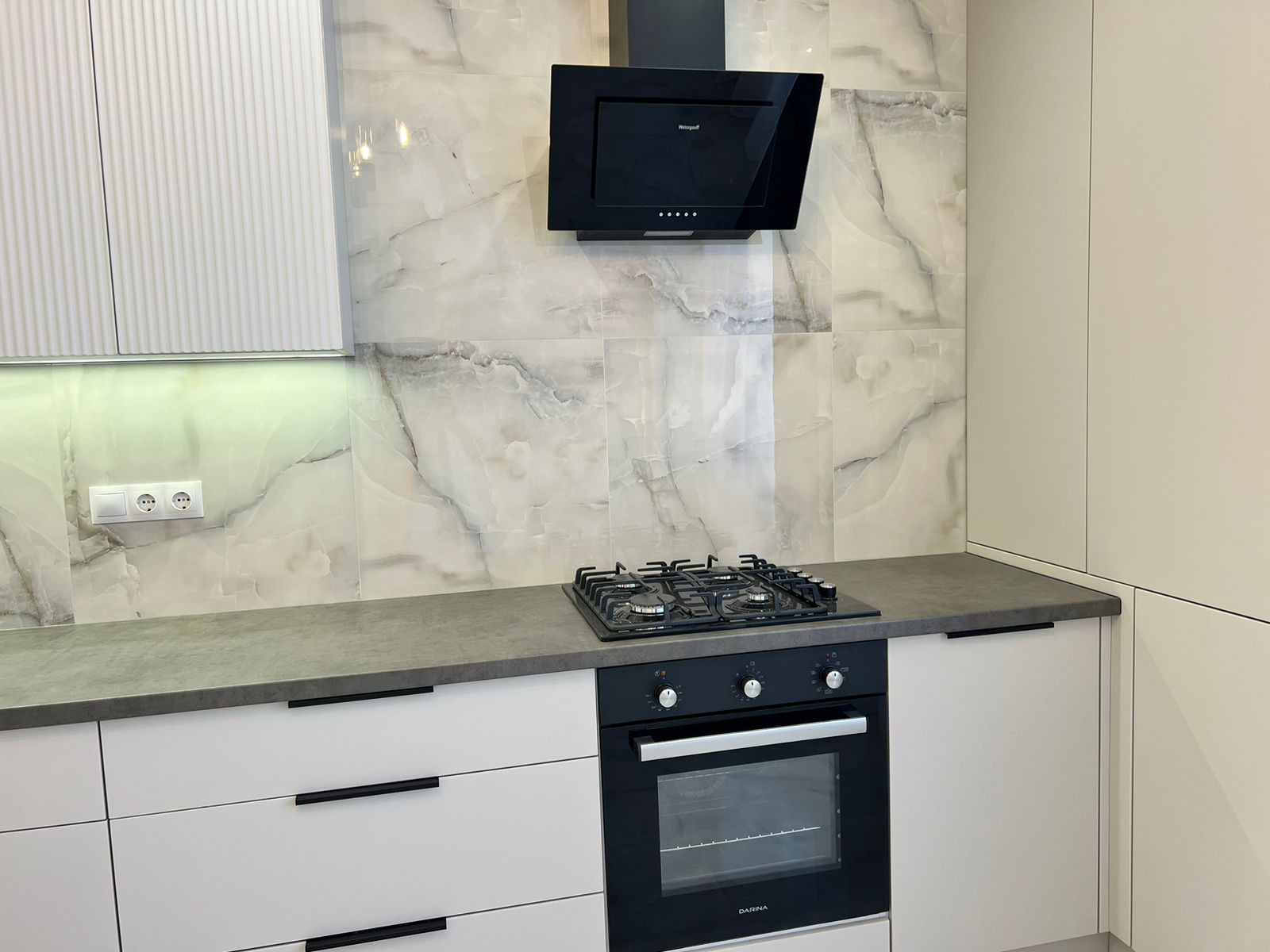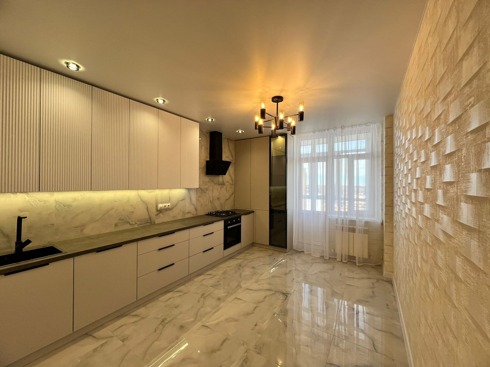 В квартире встроенная кухня с бытовой техникой (духовой шкаф, вытяжка, варочная панель.)