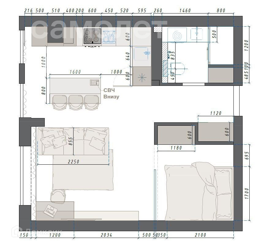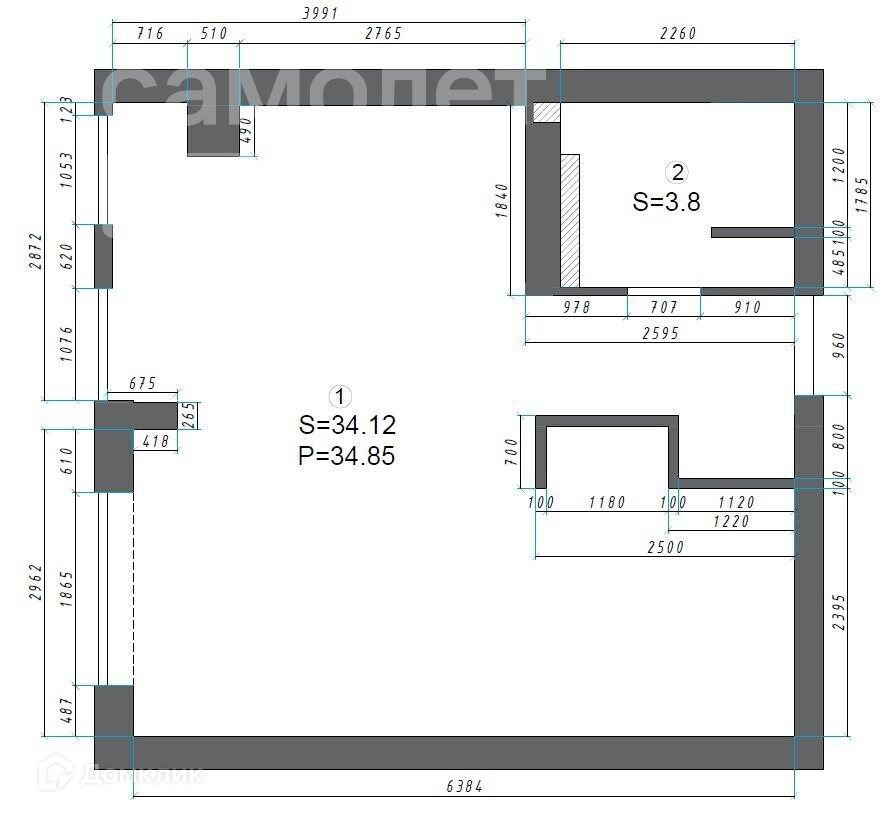 Общая площадь 34.8 м2