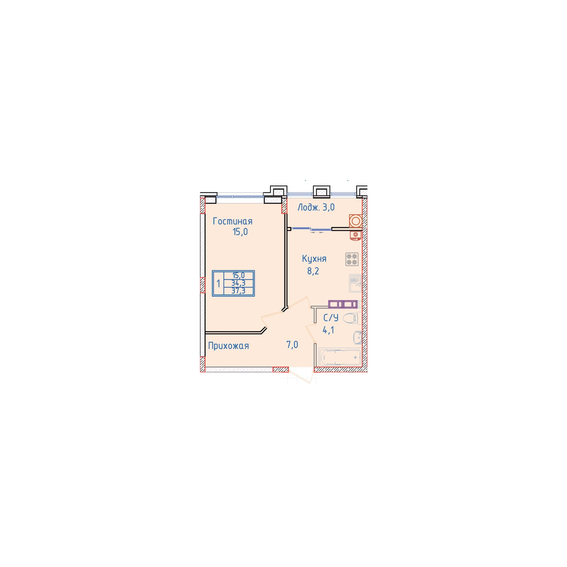 Общая площадь 38 м2