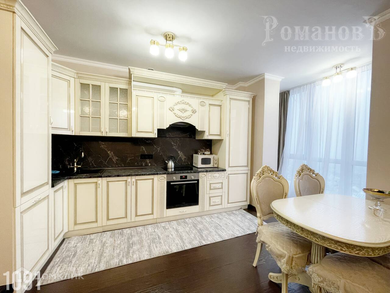 Новый кухонный гарнитур с глянцевыми фасадами цвета слоновой кости. Кухня  полностью оборудована техникой.