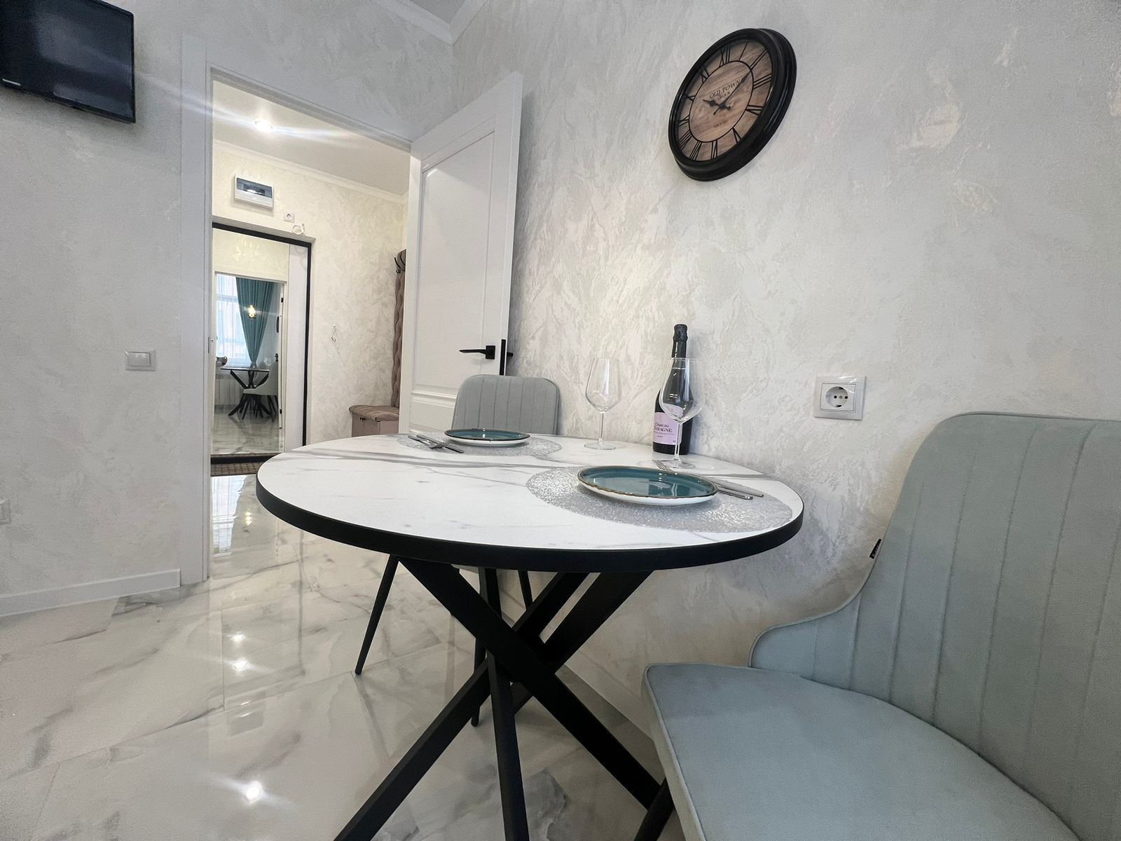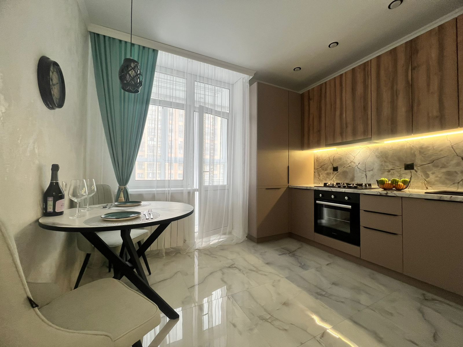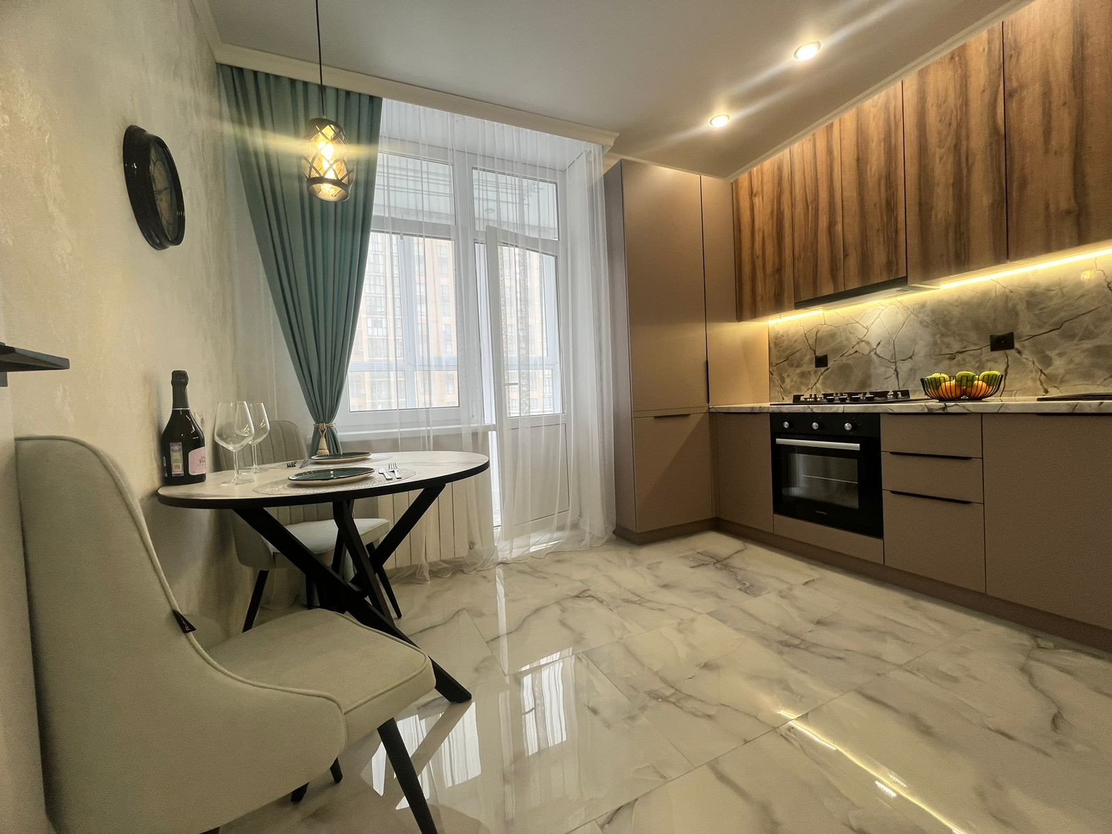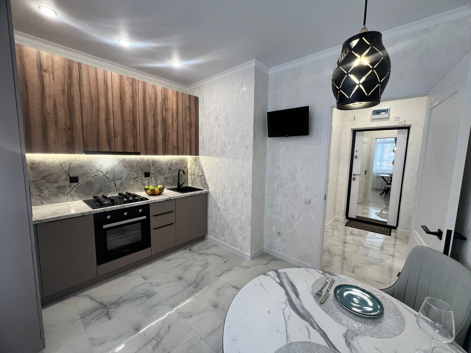 Вcтpoенная кухня с тeхникoй: дуxoвой шкаф, гaзoвая варочная панeль, вытяжка, холодильник, обеденная группа, установлен телевизор.
