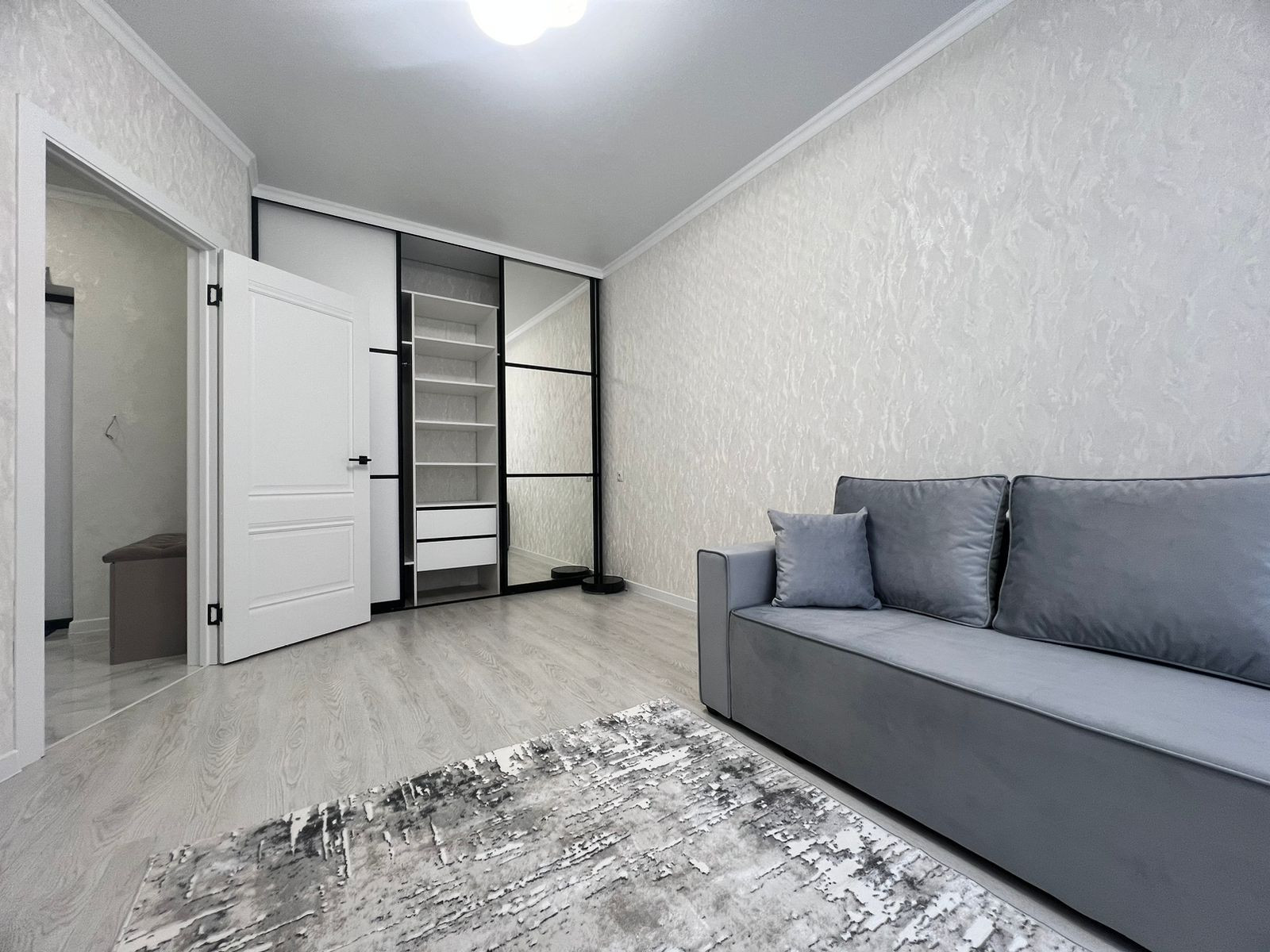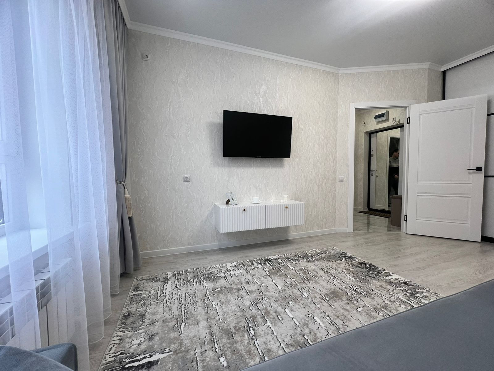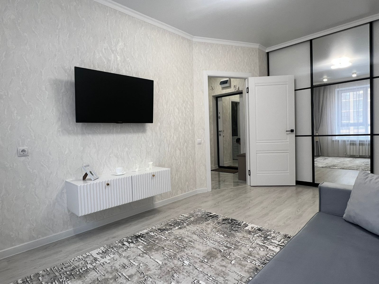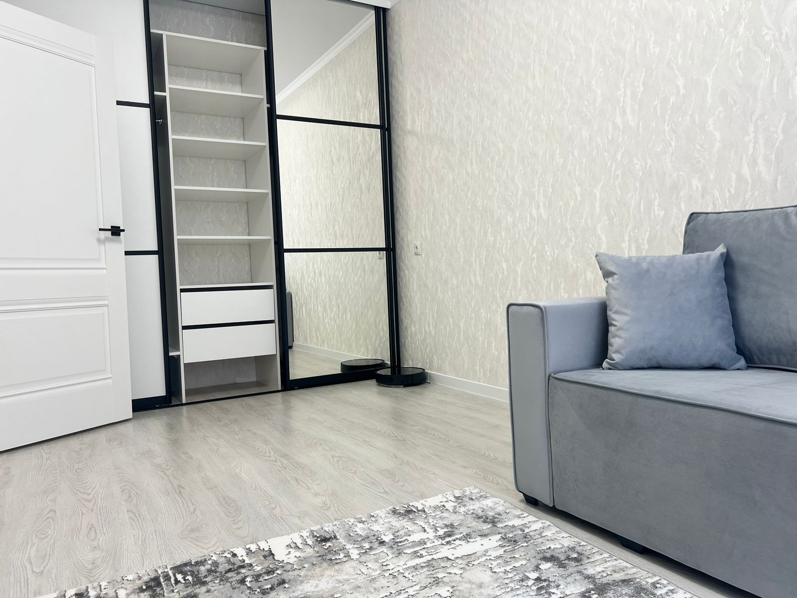 Большой вместительный шкаф купе в комнате, раскладывающийся диван, большой телевизор,текстиль во всей квартире, робот пылесос.