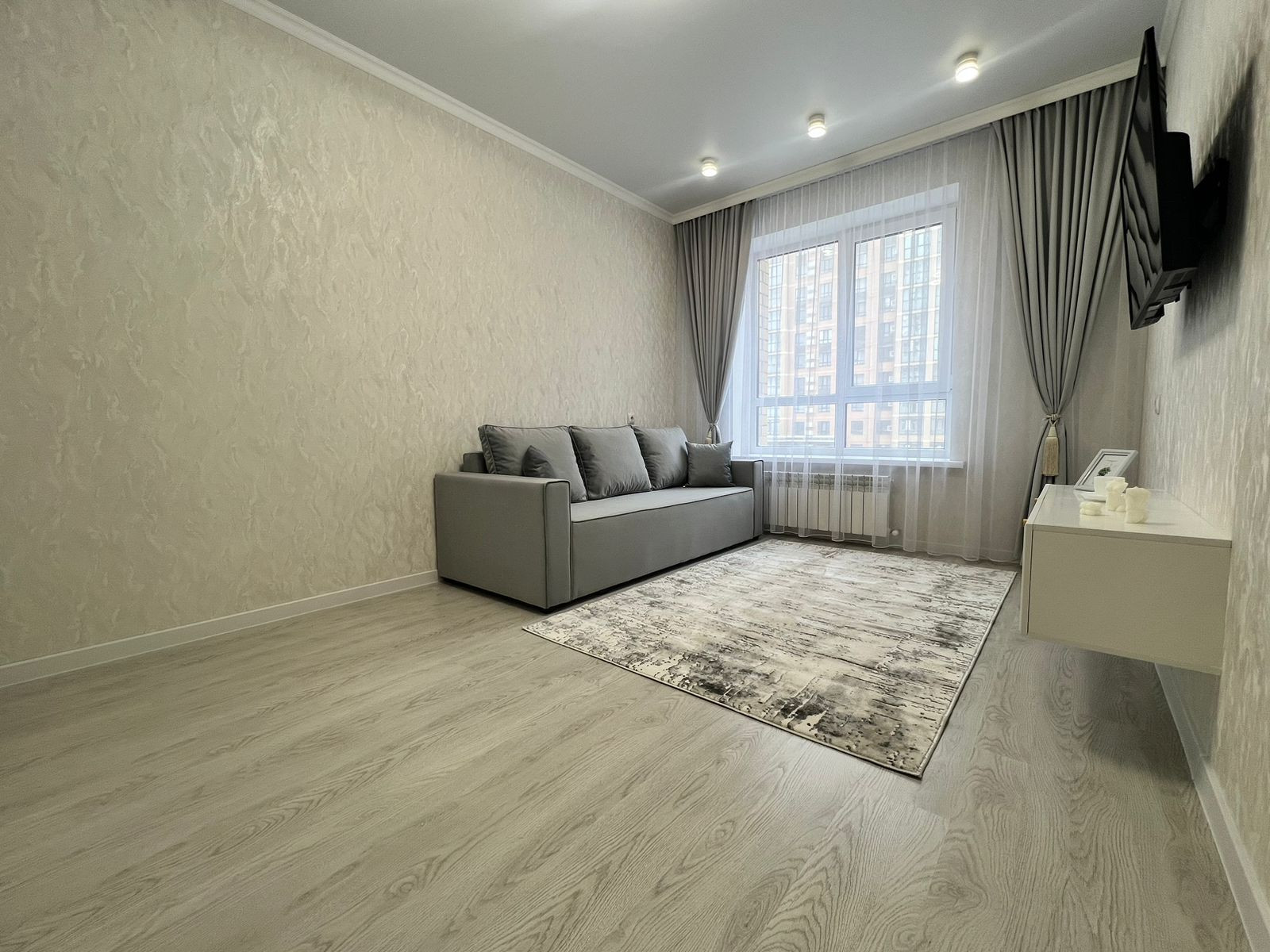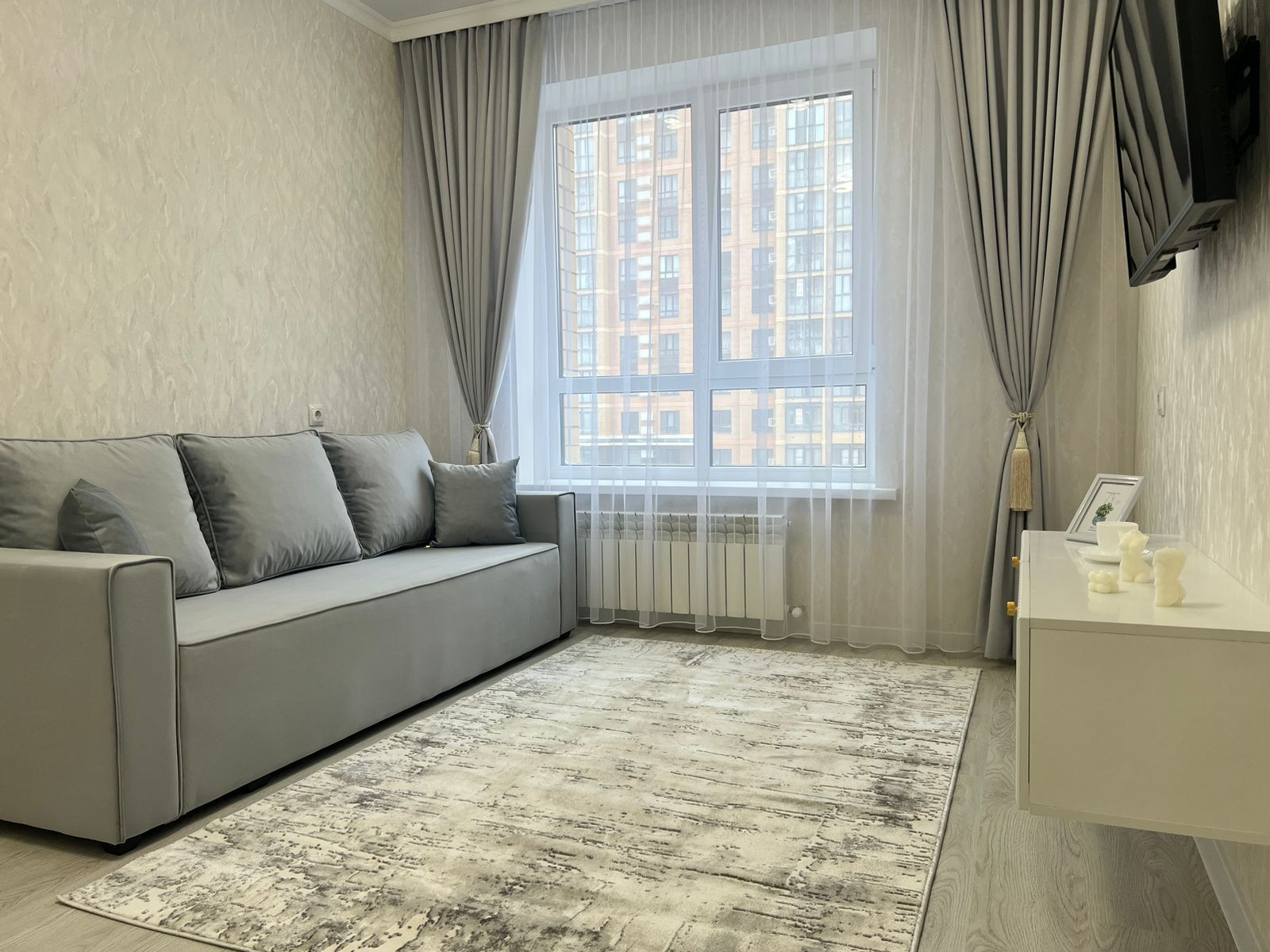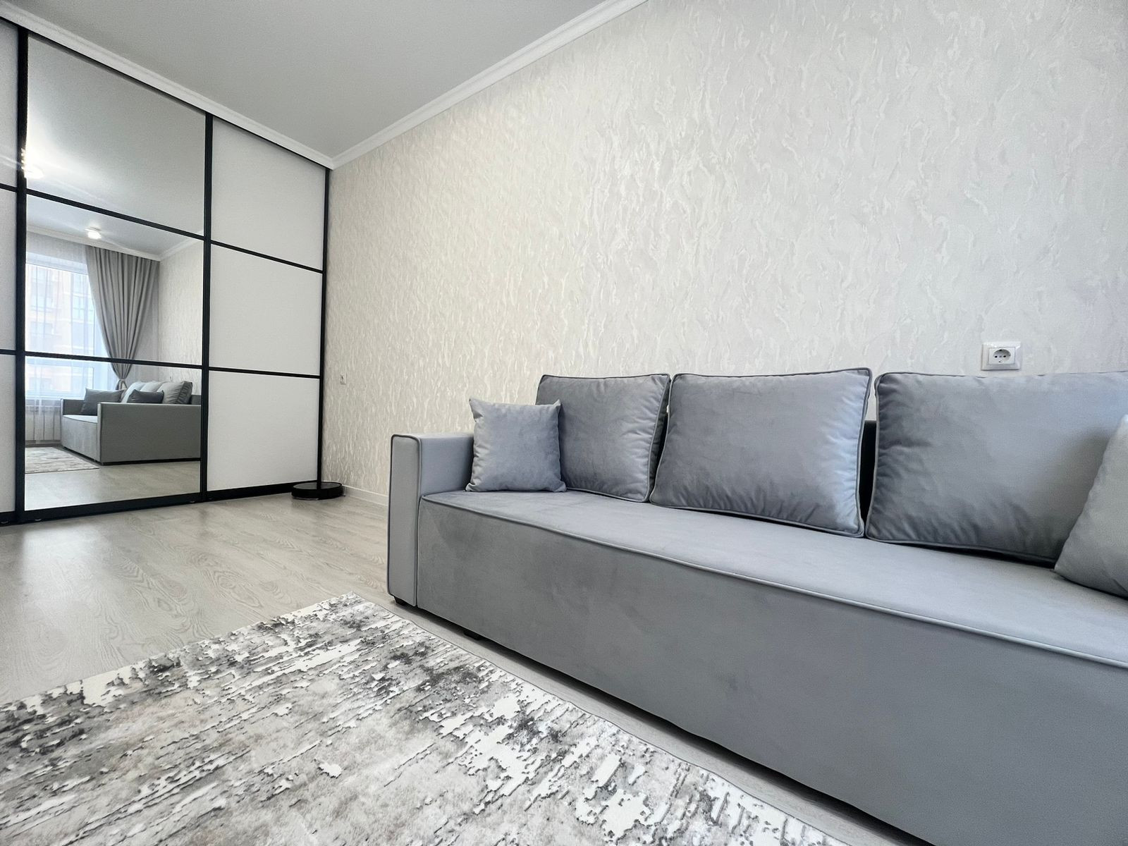 Большой вместительный шкаф купе в комнате, раскладывающийся диван, большой телевизор,текстиль во всей квартире, робот пылесос.
