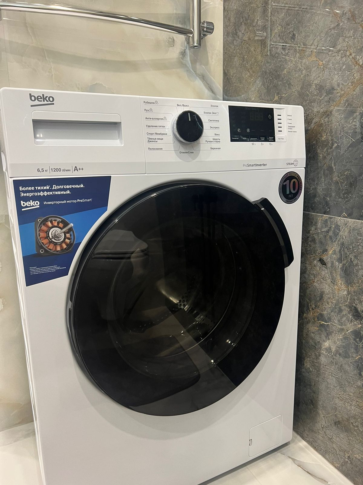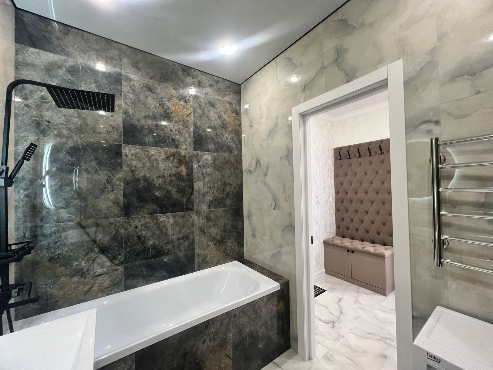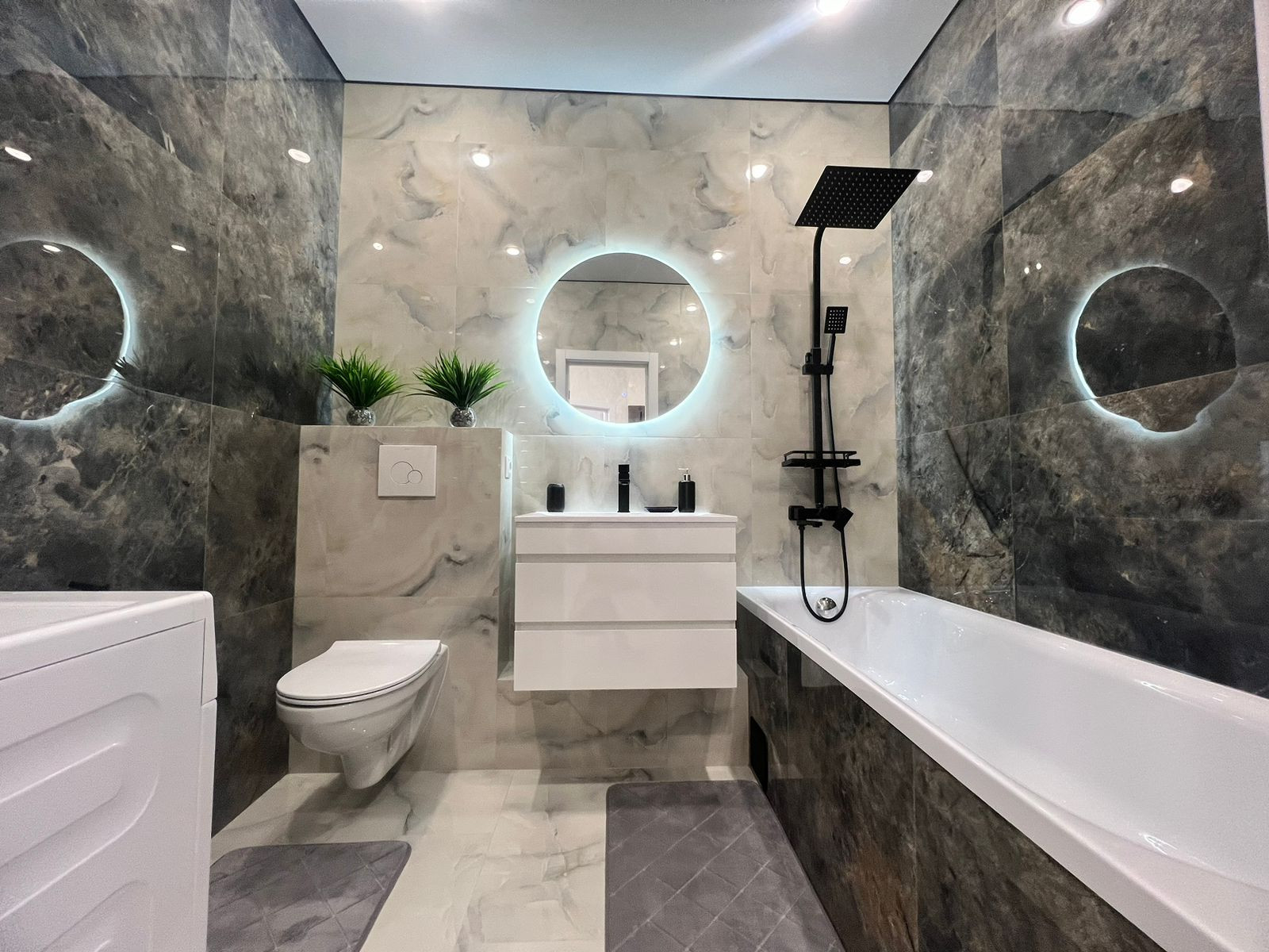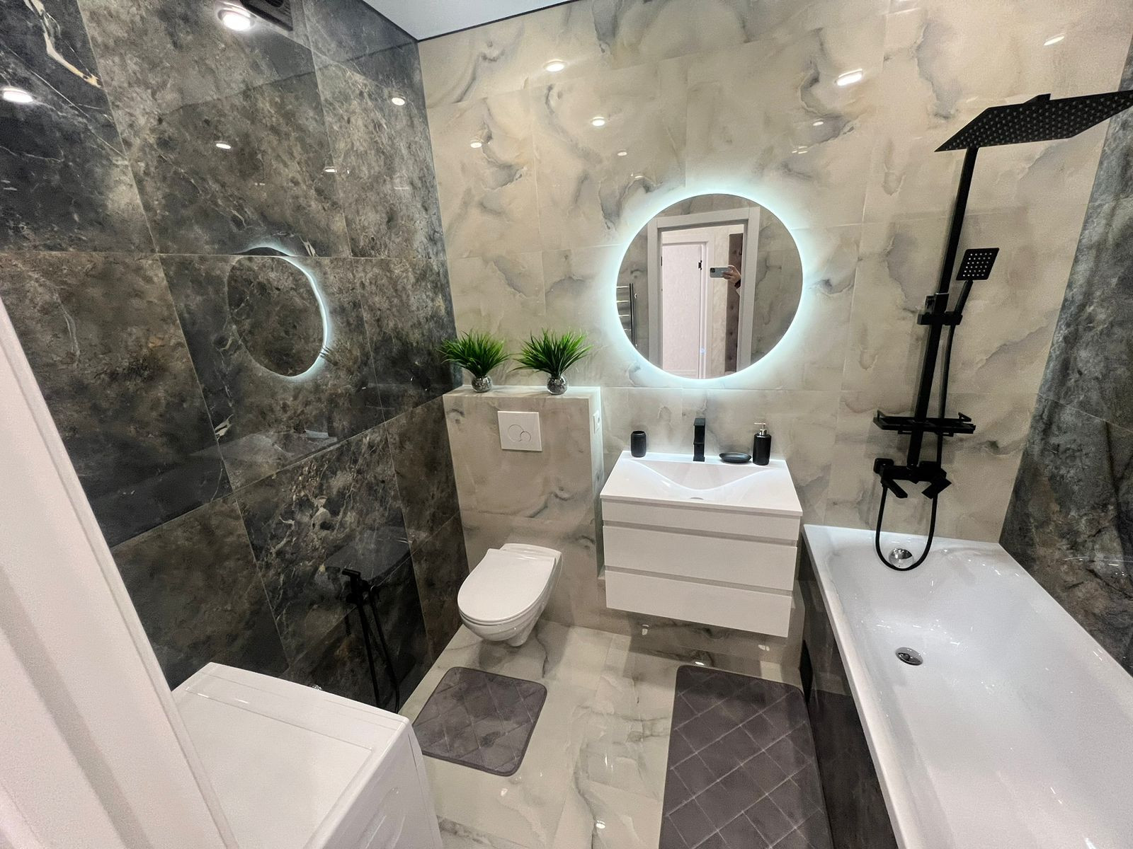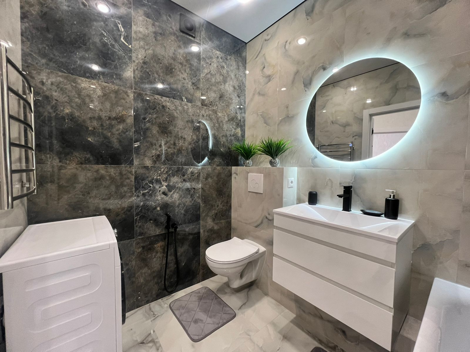 В ванной комнате установлена стиральная мaшина, качественные смесители и сантехника.