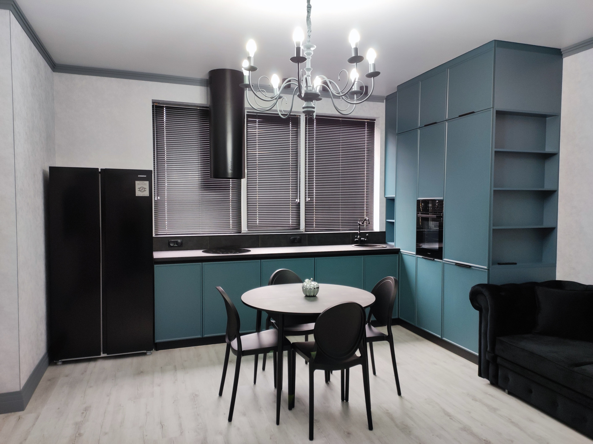большая посудомоечная машина; островная вытяжка; двухдверный холодильник; индукционная варочная панель; духовой шкаф.