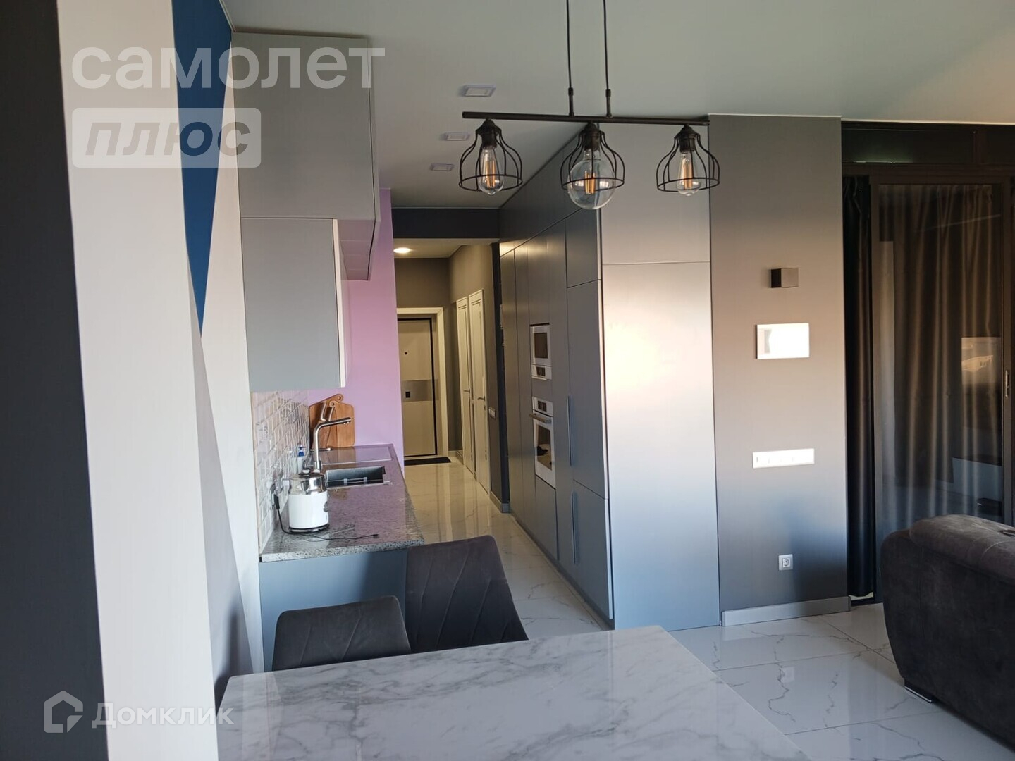 На кухне столешница из натурального гранита. Посудомойка полноценная, индукционная плита. Духовой шкаф, холодильник и микроволновая печь встроенные. Телевизор смарт, кондиционер Haier. Подоконники из натурального камня гранит в цвет столешницы. По всей квартире уложен керамогранит. В спальне установлена, парящая, кровать. Стиральная машина с сушкой.