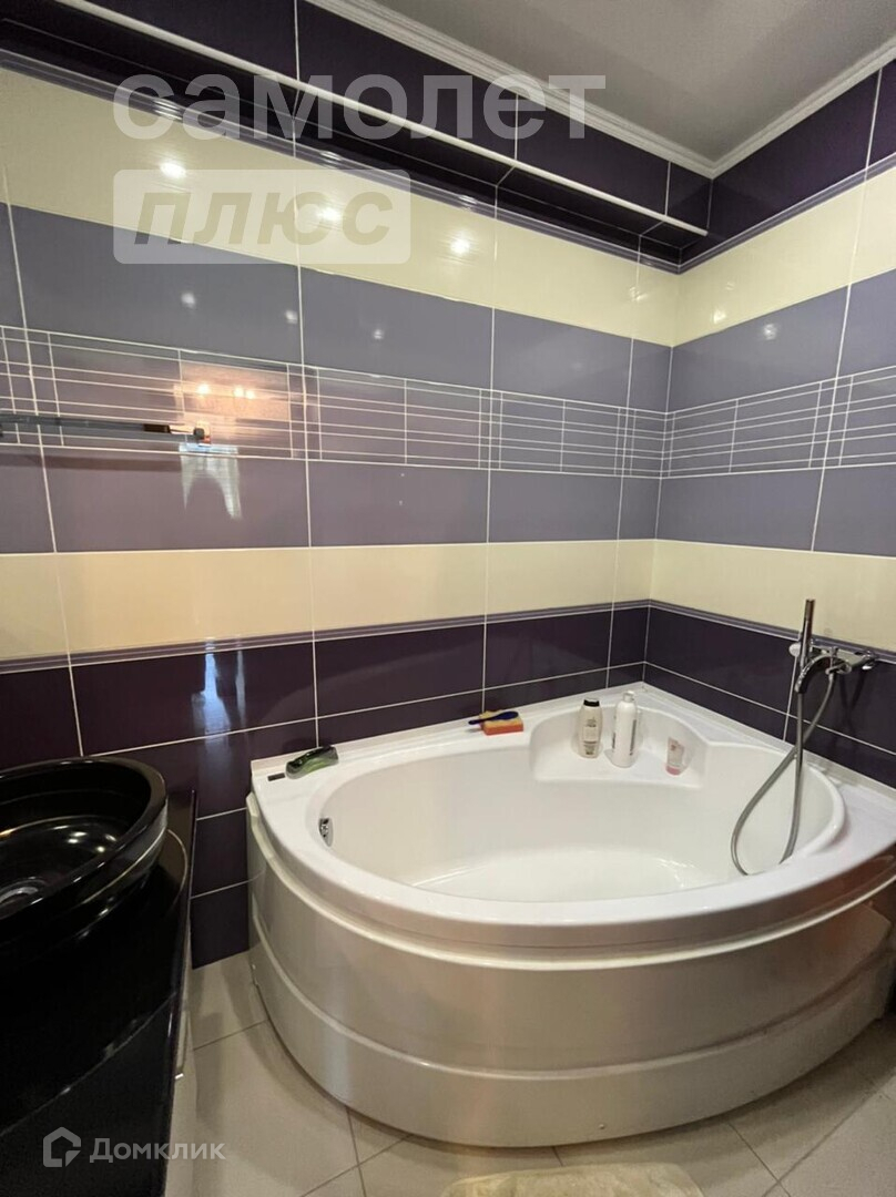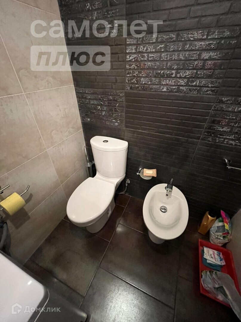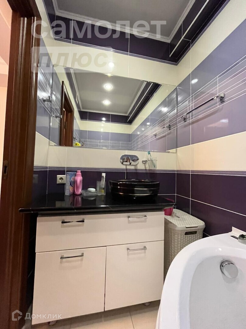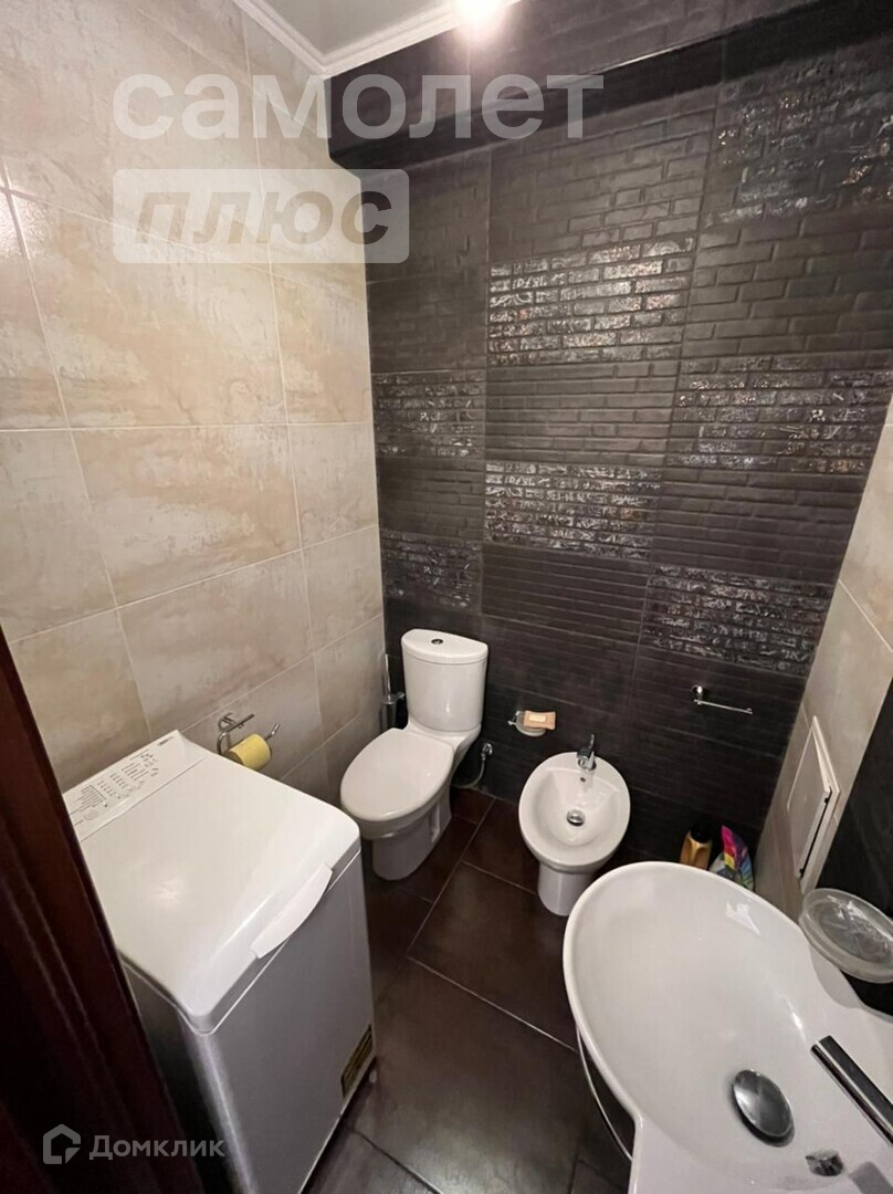 В с/у установлено также биде и стиральная машинка. В ванной зеркало на всю стену, современная ванна, дизайнерская раковина.