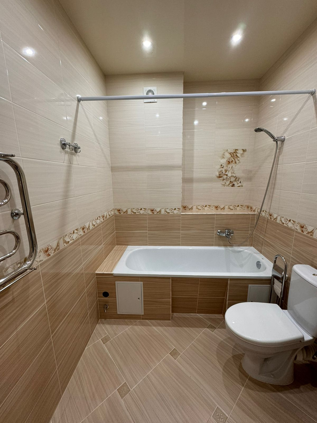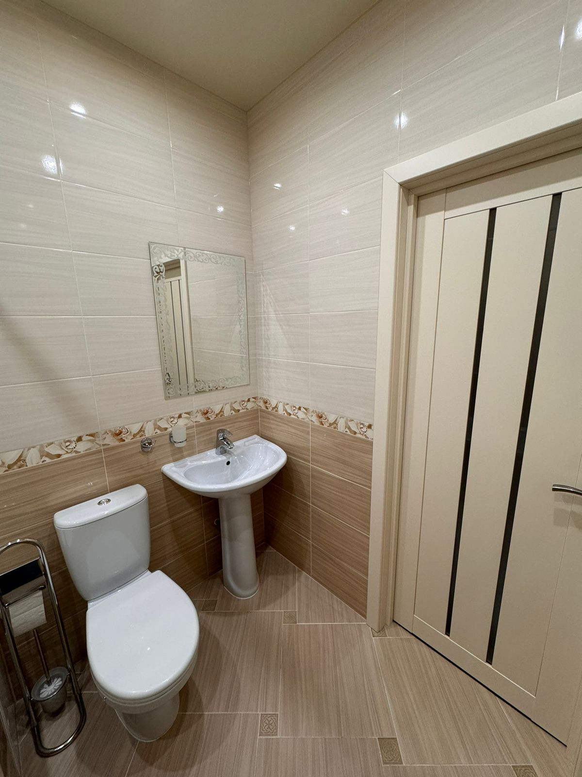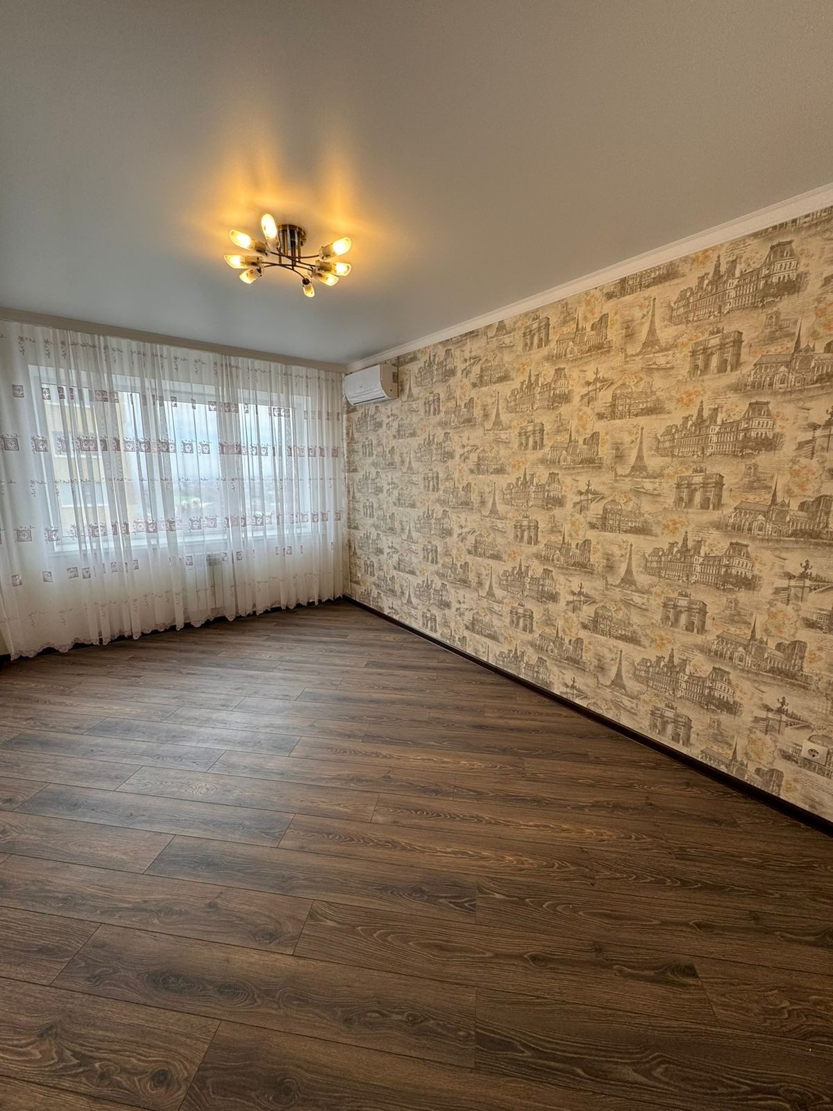 Квартира после ремонта, никто не проживал. На полу в комнате ламинат, в кухне и коридоре керамогранит, в санузле кафель, натяжные потолки.