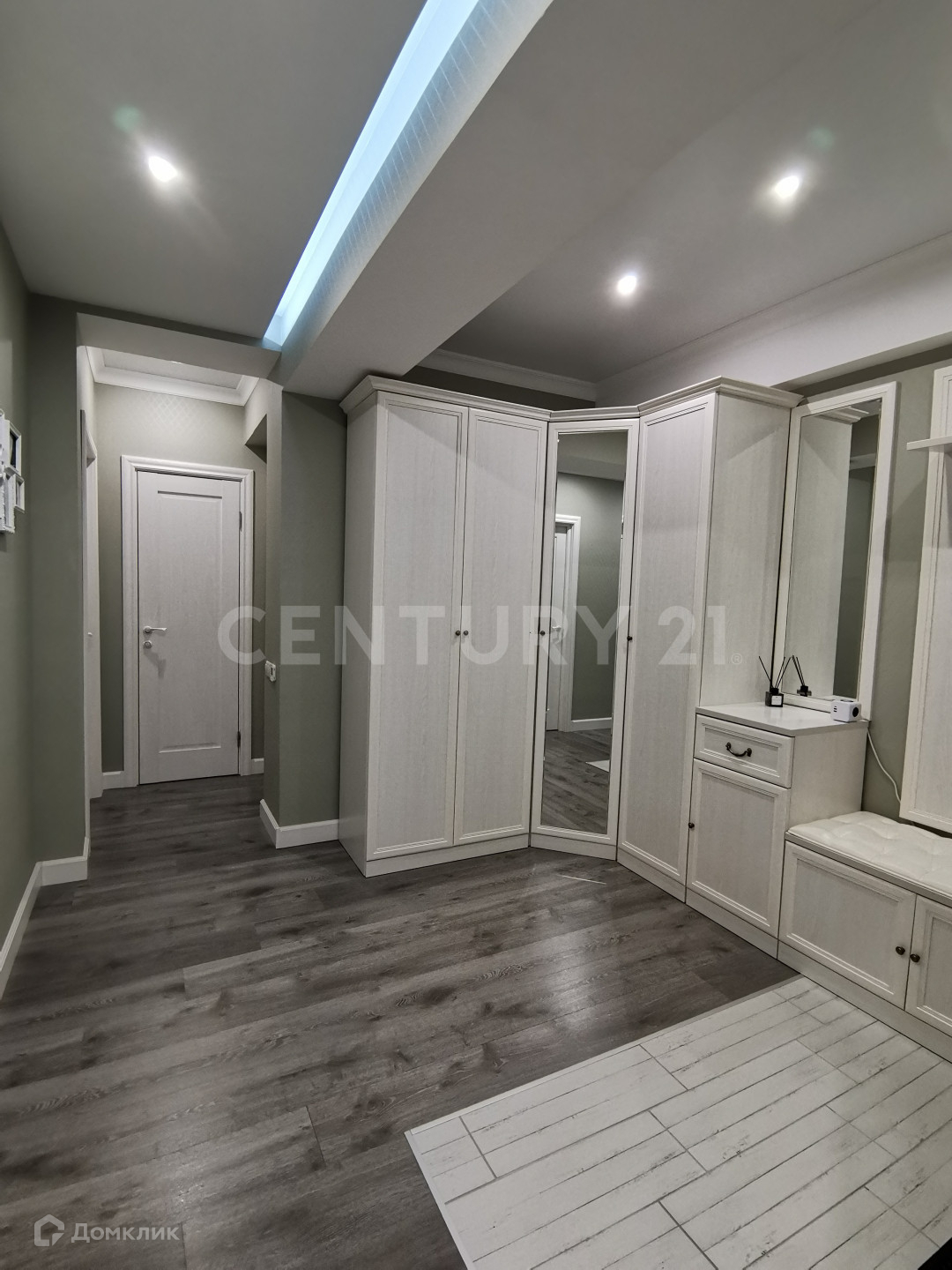Диодная подсветка на кухне (рабочая зона, контур потолка) и в коридоре на потолке.