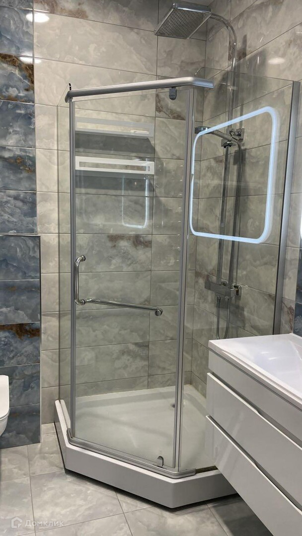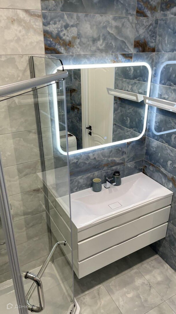 В ванной комнате: подвесной унитаз фирмы ROCA, душевая система с термостатом Gappo. Большое зеркало с подсветкой, тумба под раковину со смесителем фирмы "Gappo".