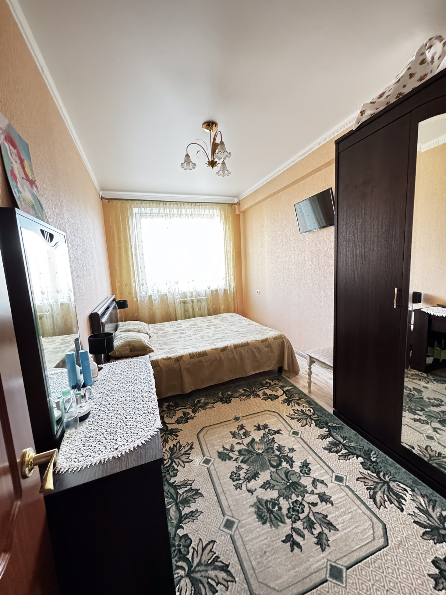 Остаётся мебель в спальне, большой встроенный шкаф в прихожей, встроенная кухня с техникой. В ванной стиральная машина.