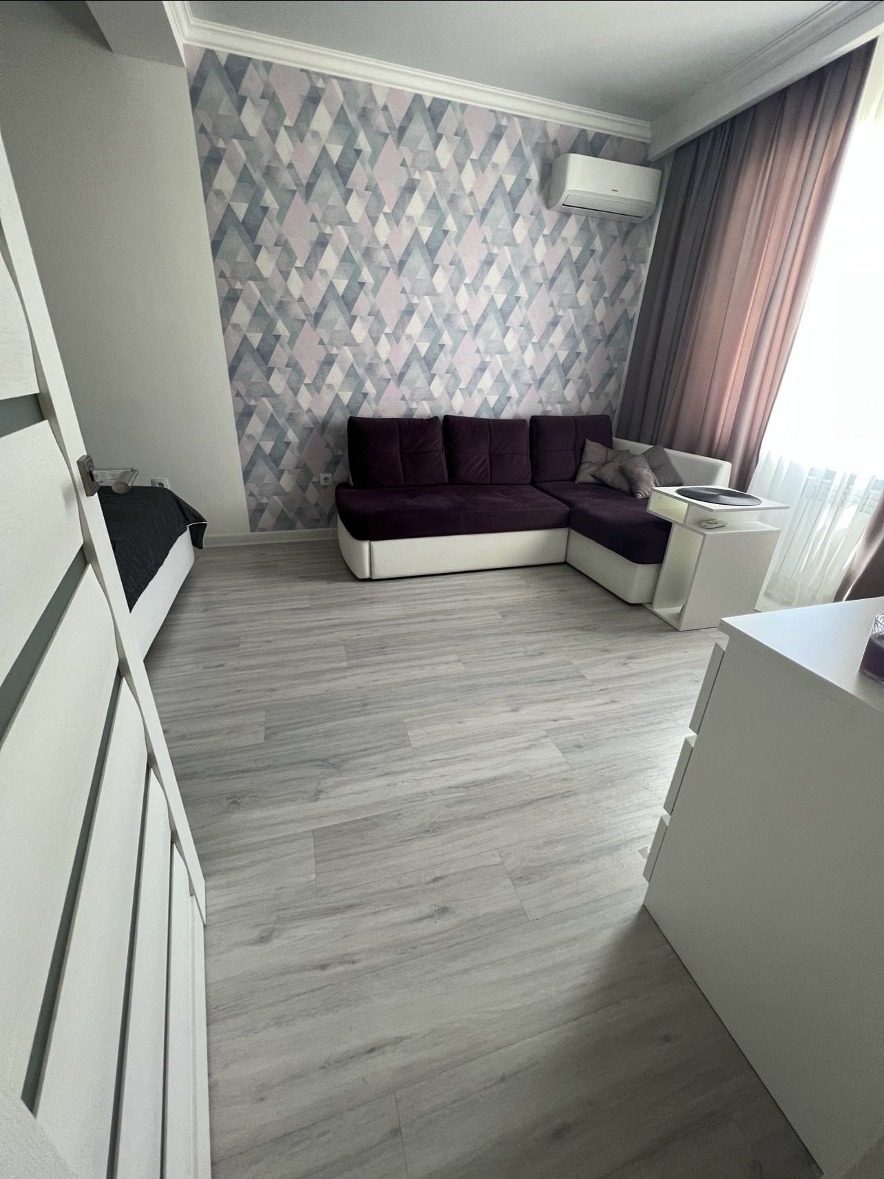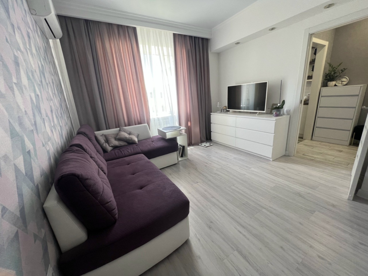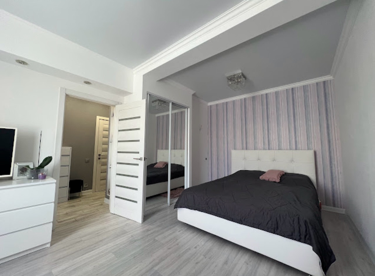 В квартире выполнен качественный современный ремонт. Остается кухонный гарнитур, варочная панель, вытяжка, два шкафа купе, комод, сплит-система.