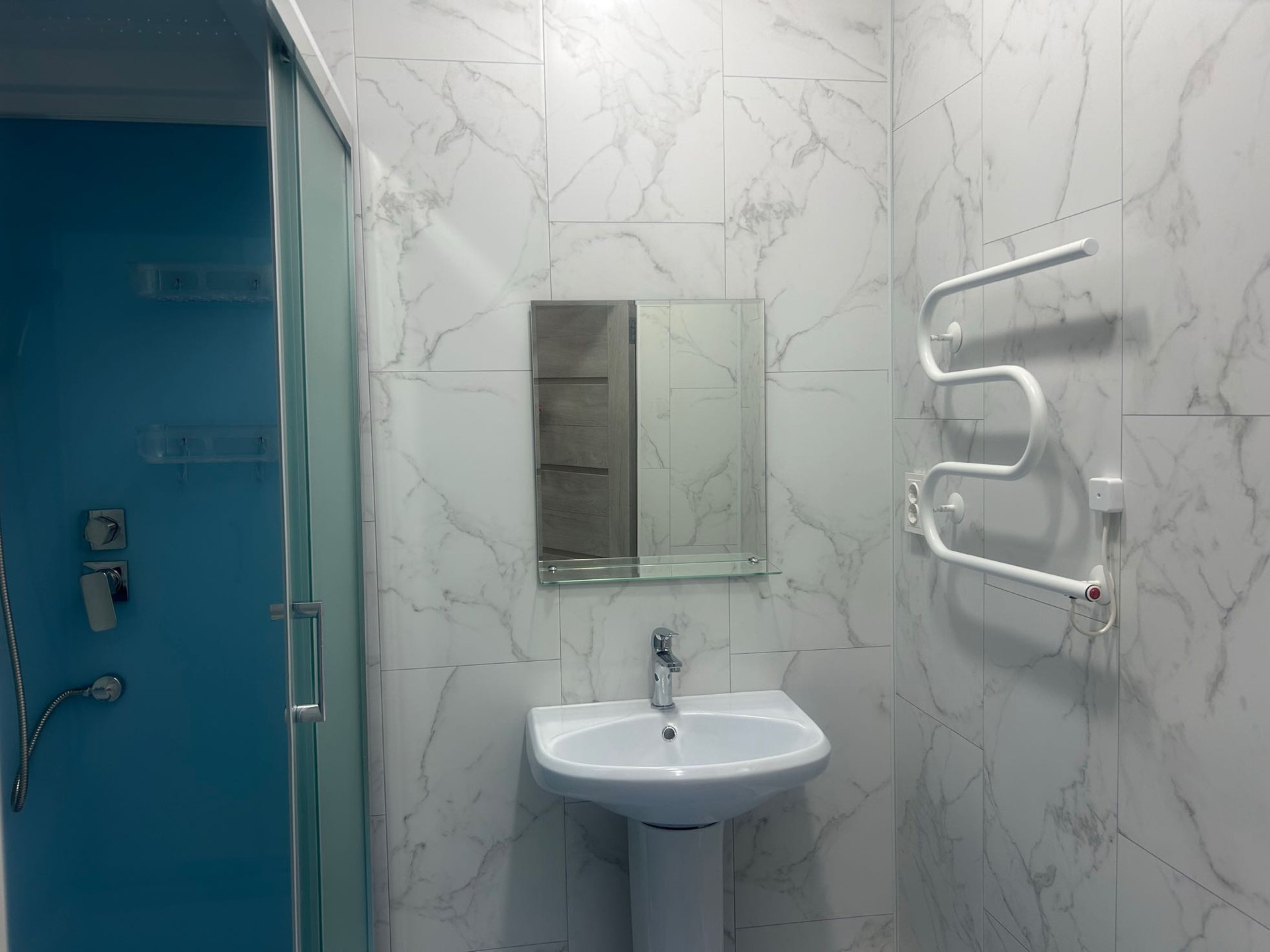 В сан узле просторная душевая кабина квадратной формы шириной 1м на 1м