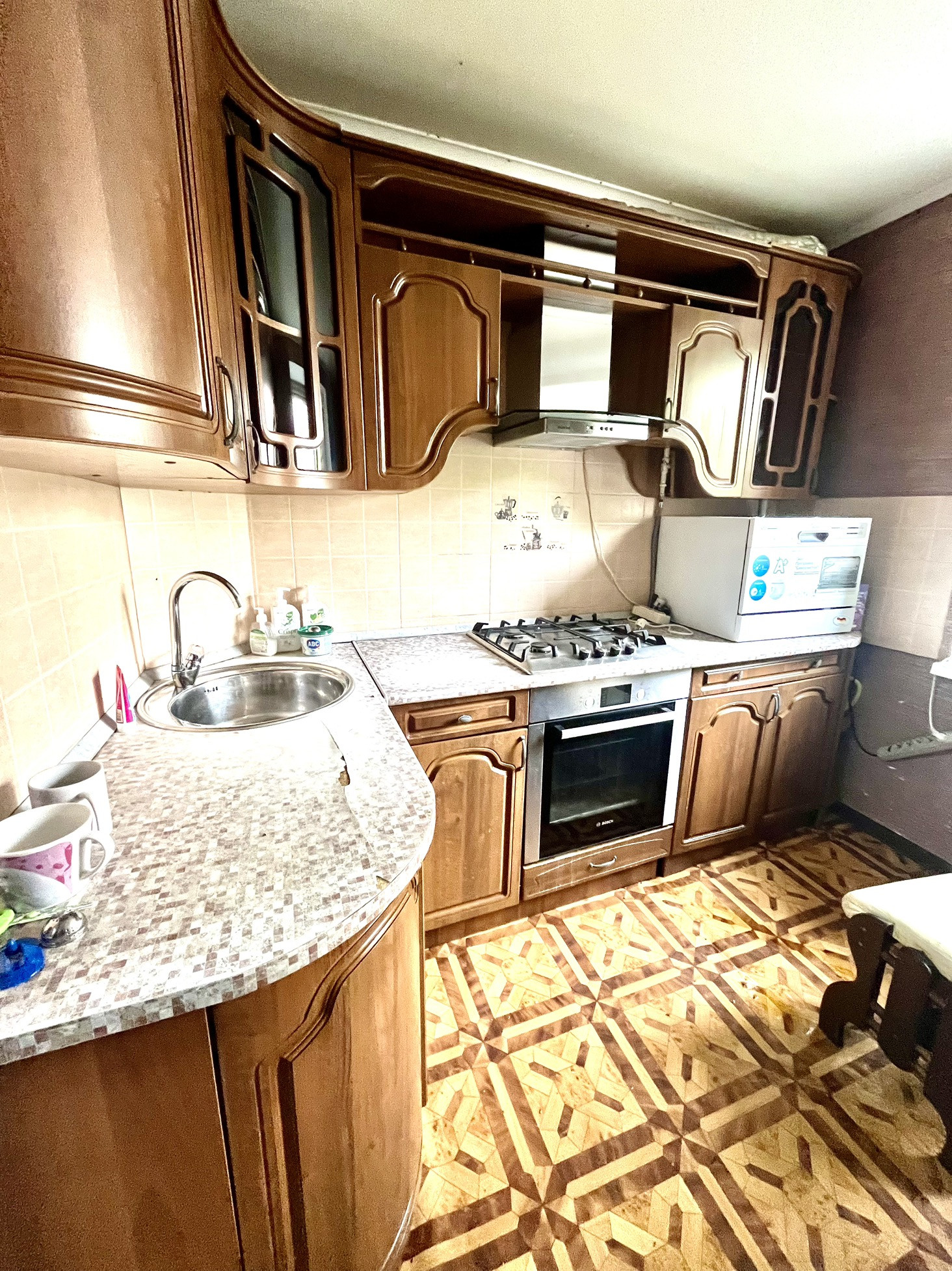 Большая кухня, с встроенной мебелью и техникой ( варочная панель, духовой шкаф, посудомоечная машинка, вытяжка) и обеденной группой.