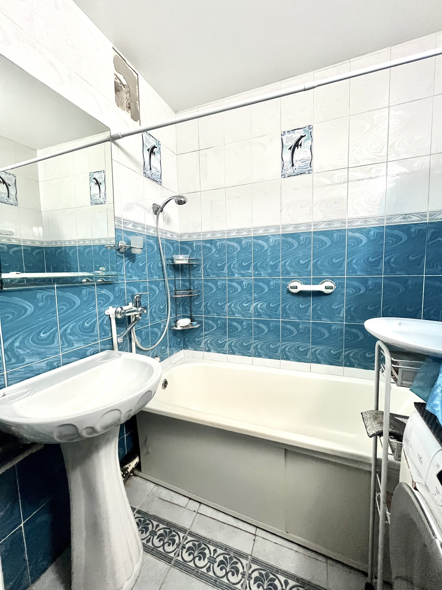 Санузел раздельный в керамической плитки, стиральная машина.