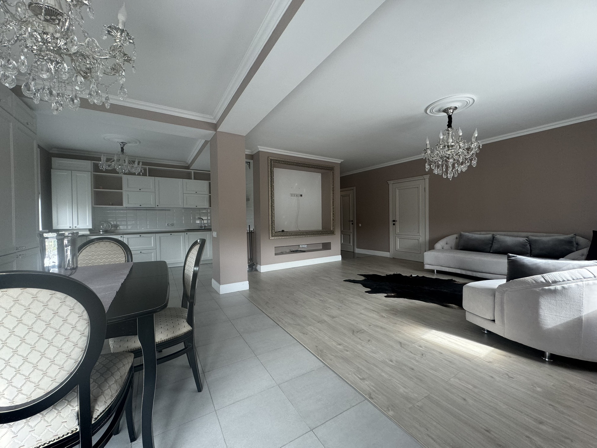 1. просторная кухня - гостиная, разделенная на зоны: гостиная, кухня, обеденная зона.