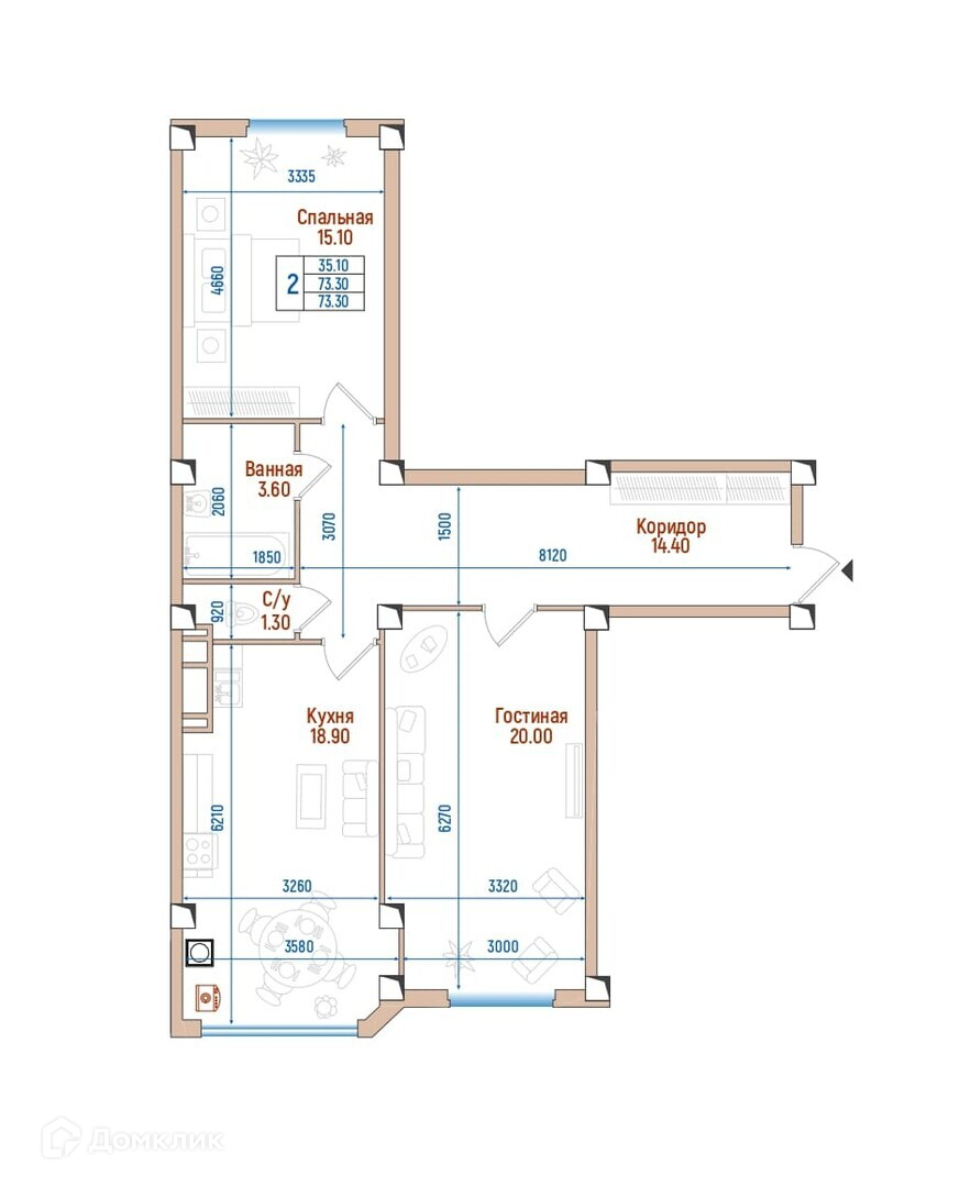 Жилая площадь 35.1 м2