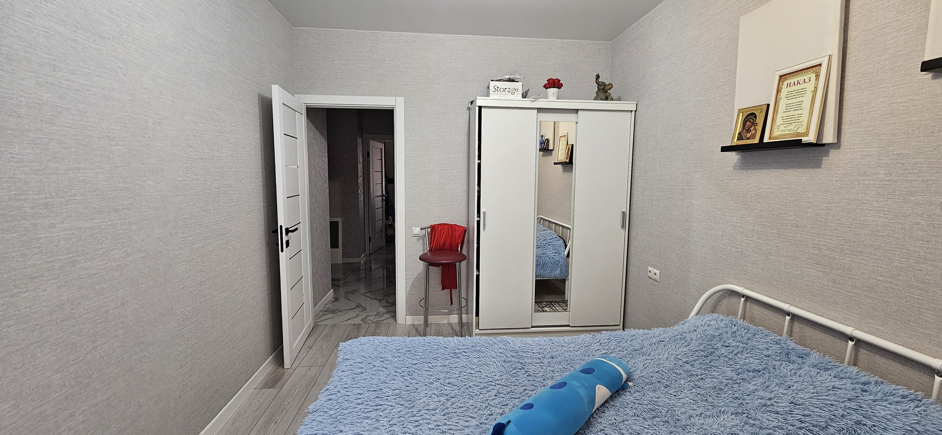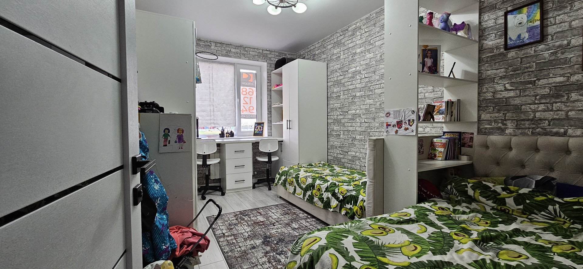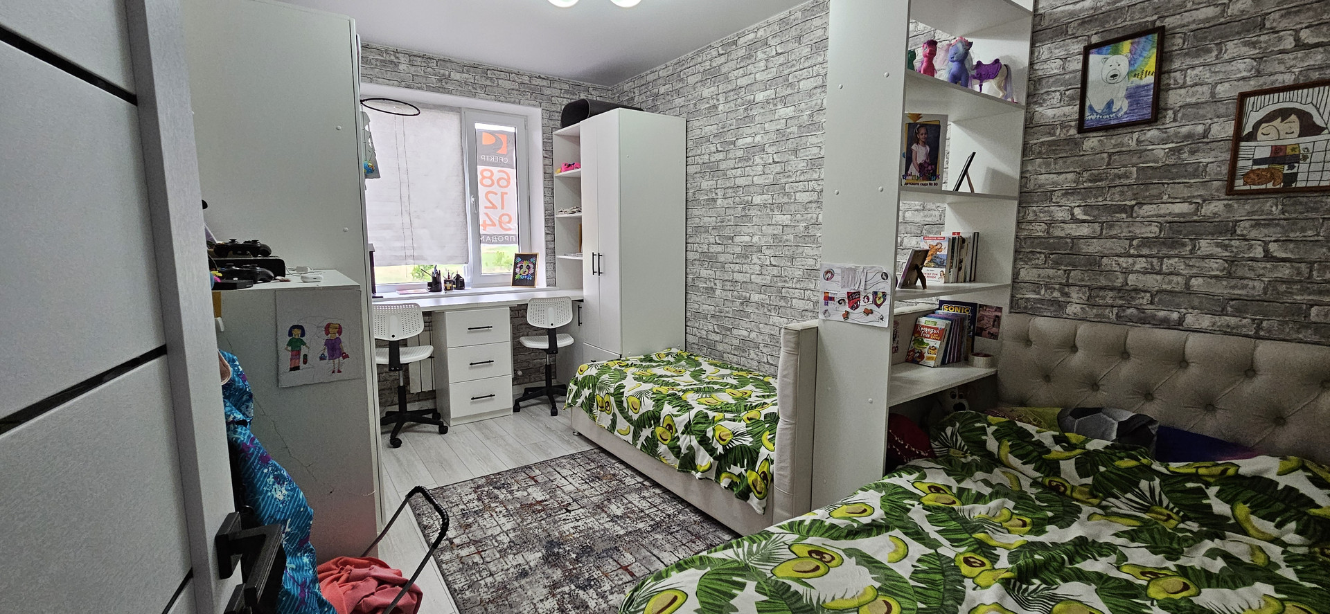 При продаже остается встроенный кухонный гарнитур, варочная панель, духовой шкаф, вытяжка, обеденный стол, в коридоре шкаф, в детской, встроенные столы и тумбы для хранения.