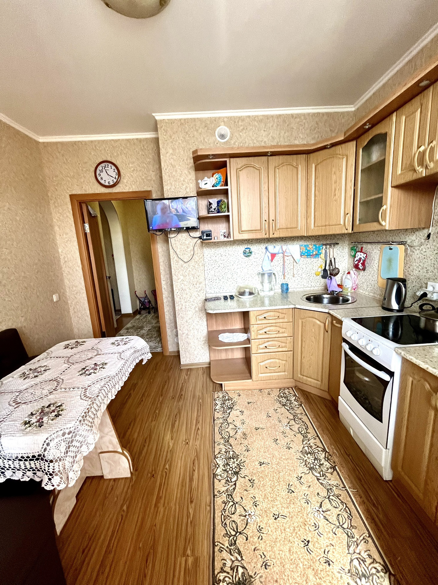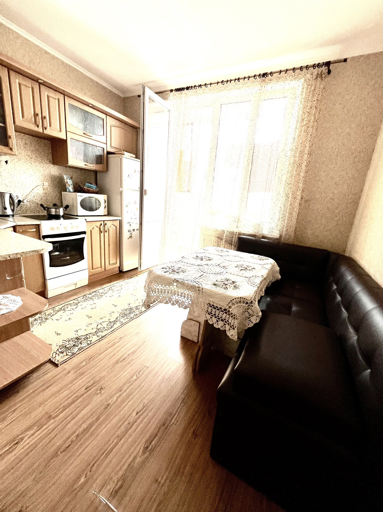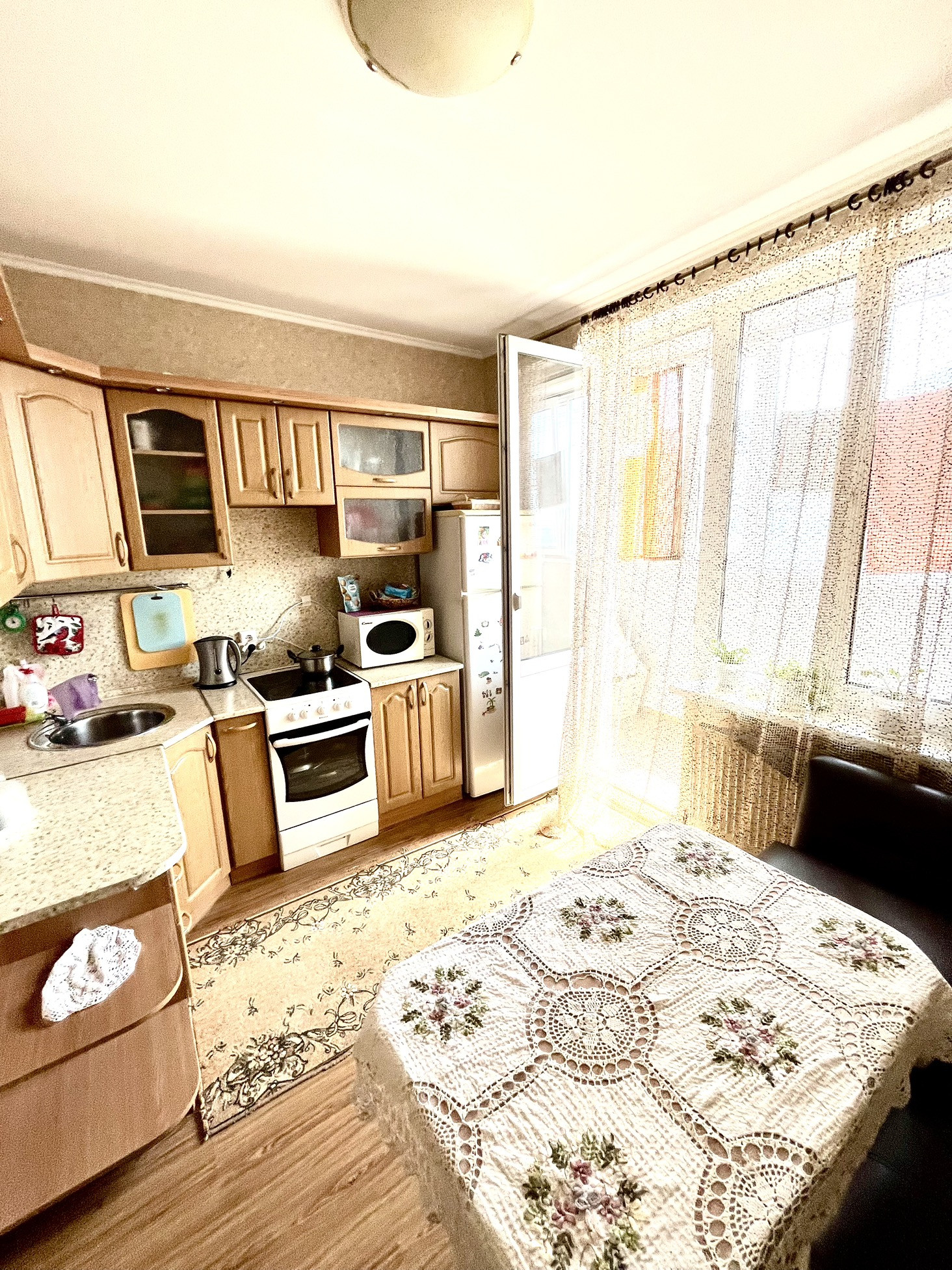 Кухня просторная, с выходом на облагороженную лоджию.