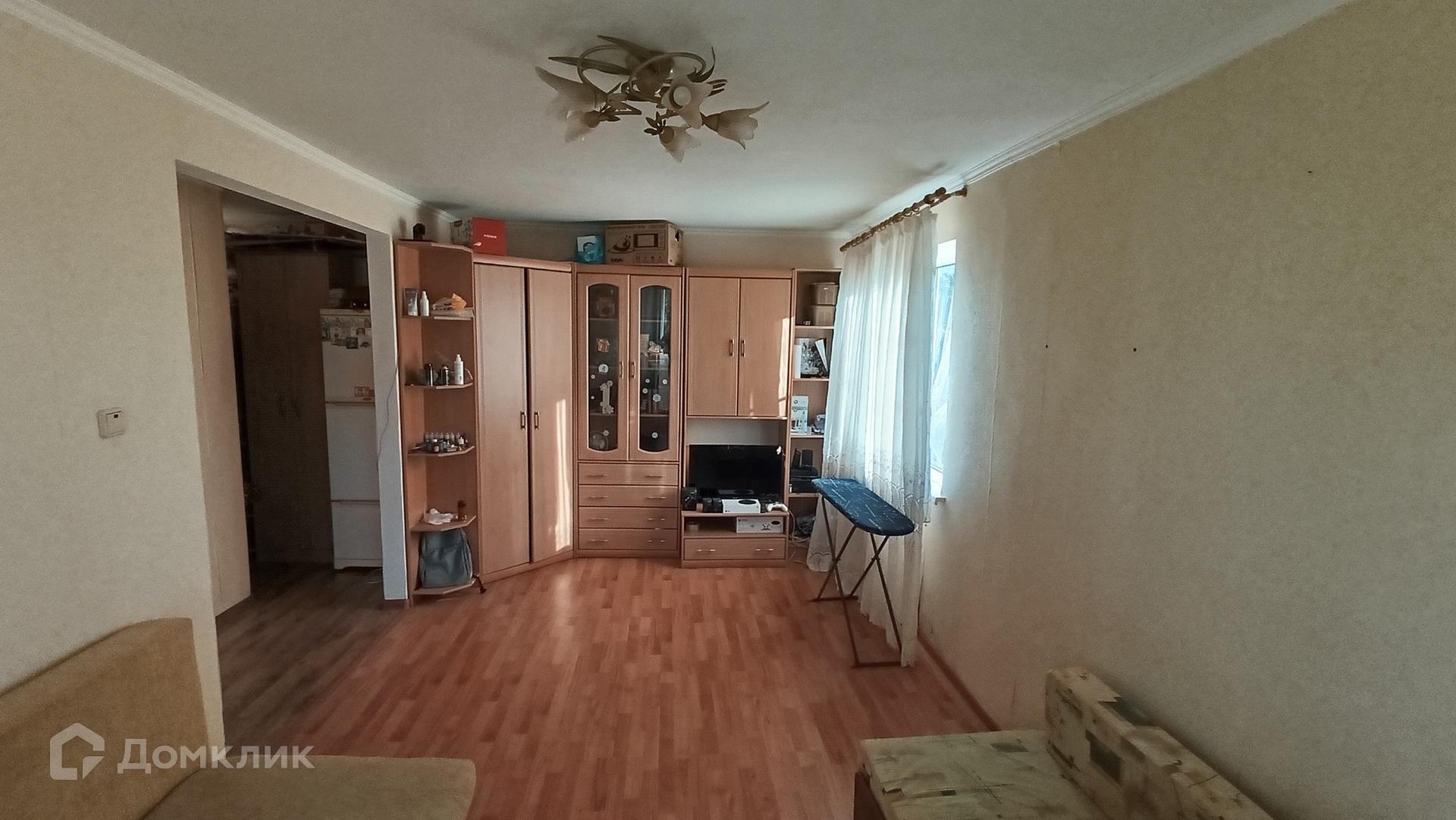На полу ламинат. Есть вся необходимая мебель и техника.