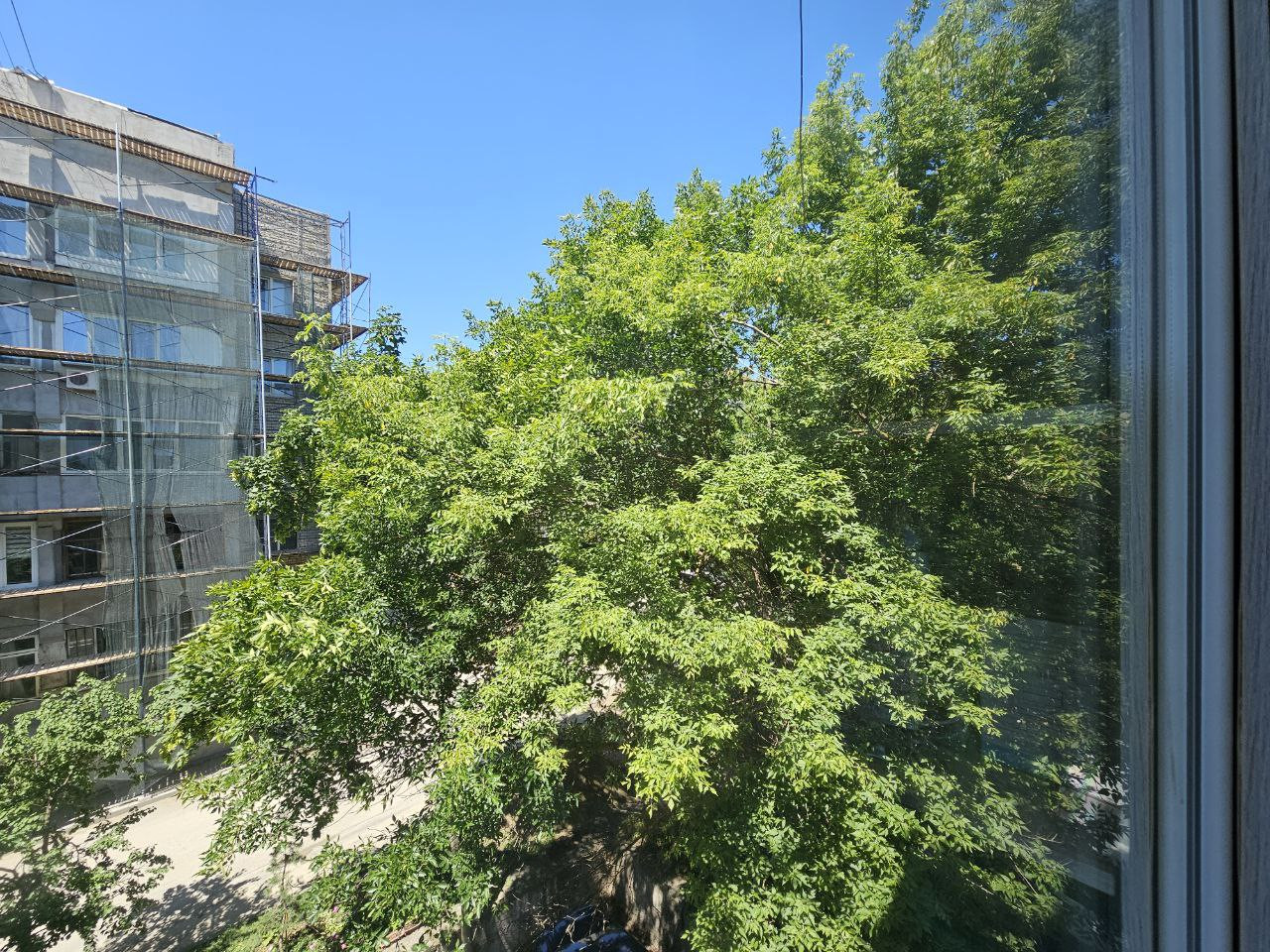 Прекрасный вид из окон: окна выходят на зеленый двор с множеством деревьев.