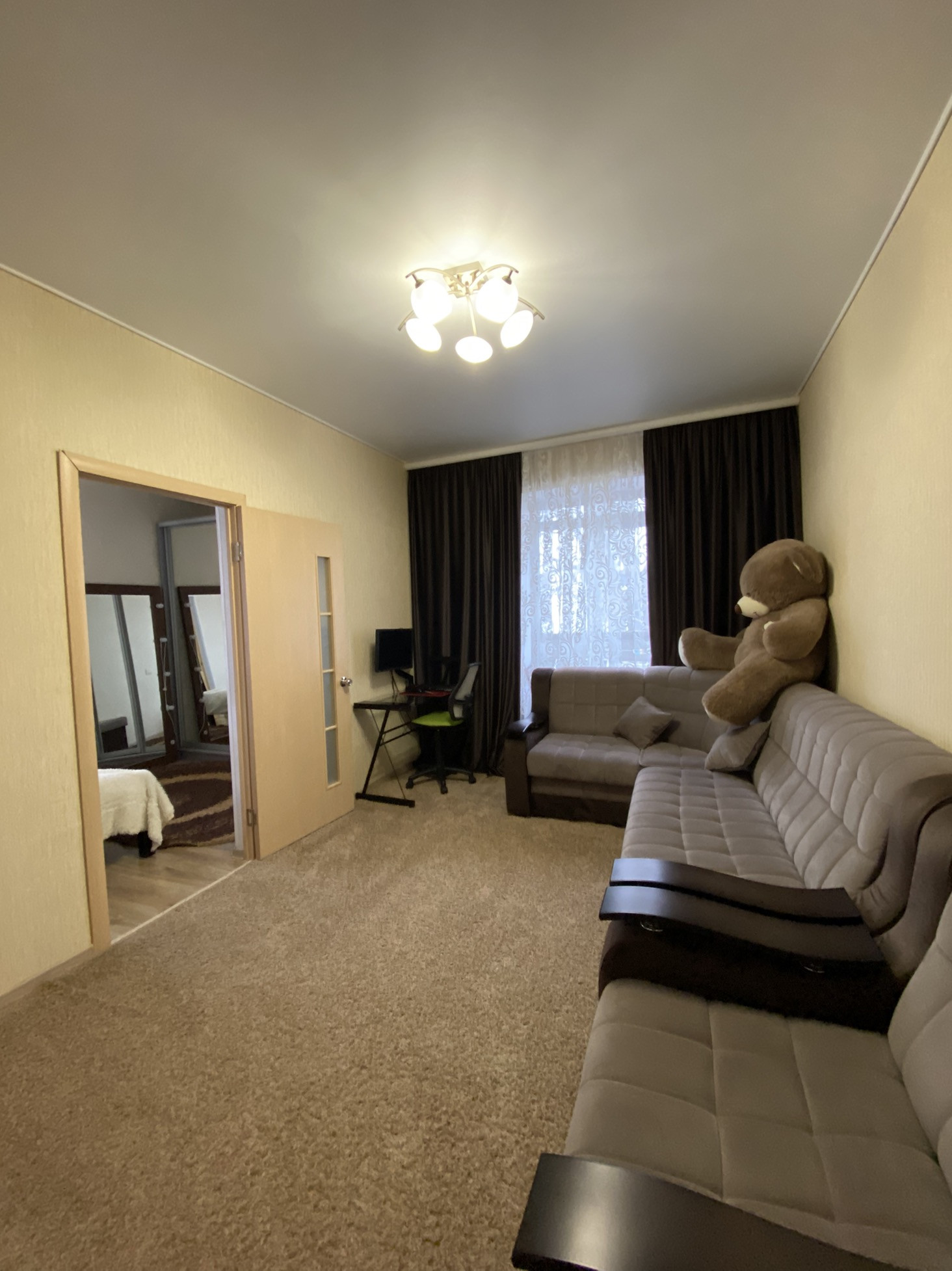 В комнате есть двухспальная кровать с матрасом и зеркальный шкаф купе.Много места для хранения! За счет зеркальных дверей пространство выглядит больше!