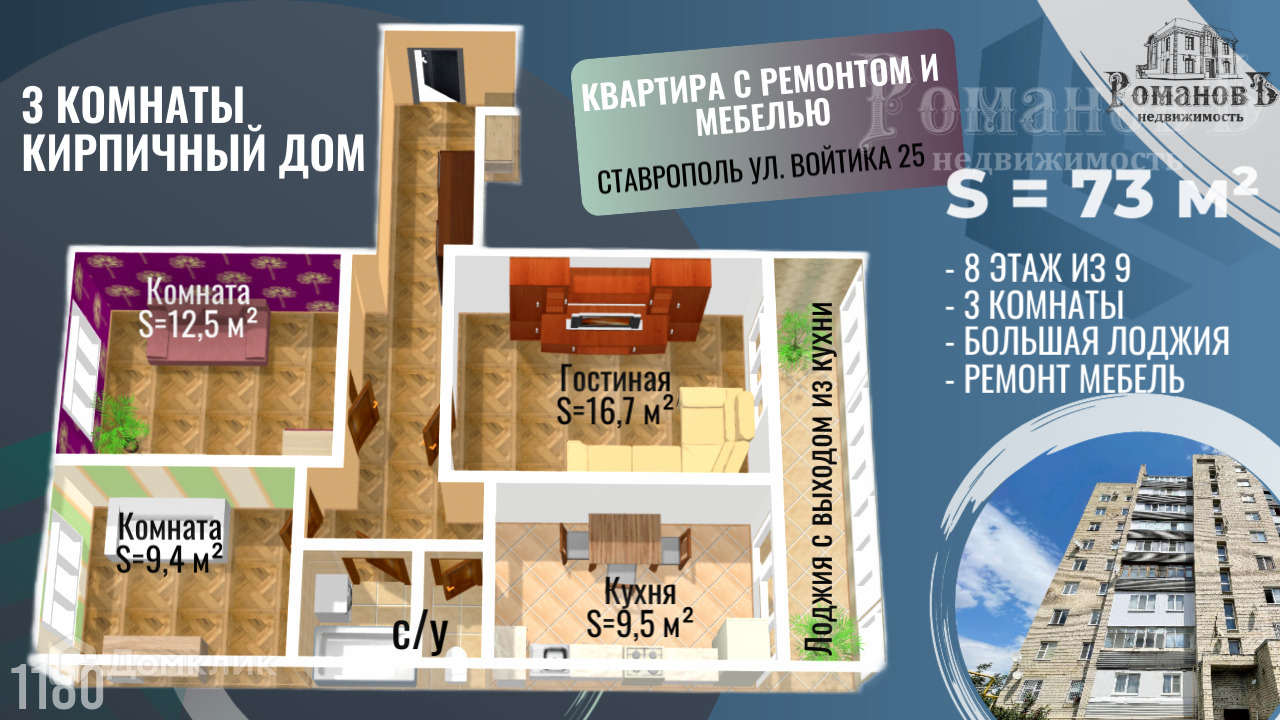 3-комнатная квартира, 73.1 м2, этаж 8 / 9, на продажу в Ставрополе, улица Войтика, 25