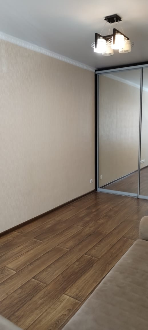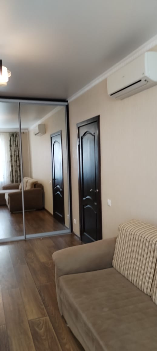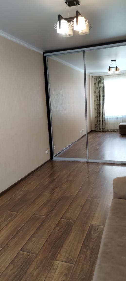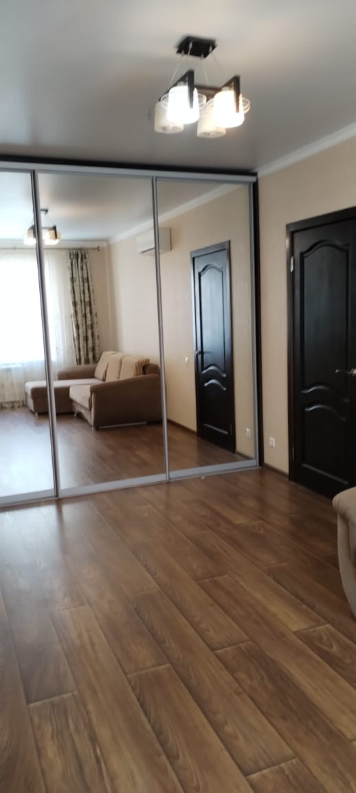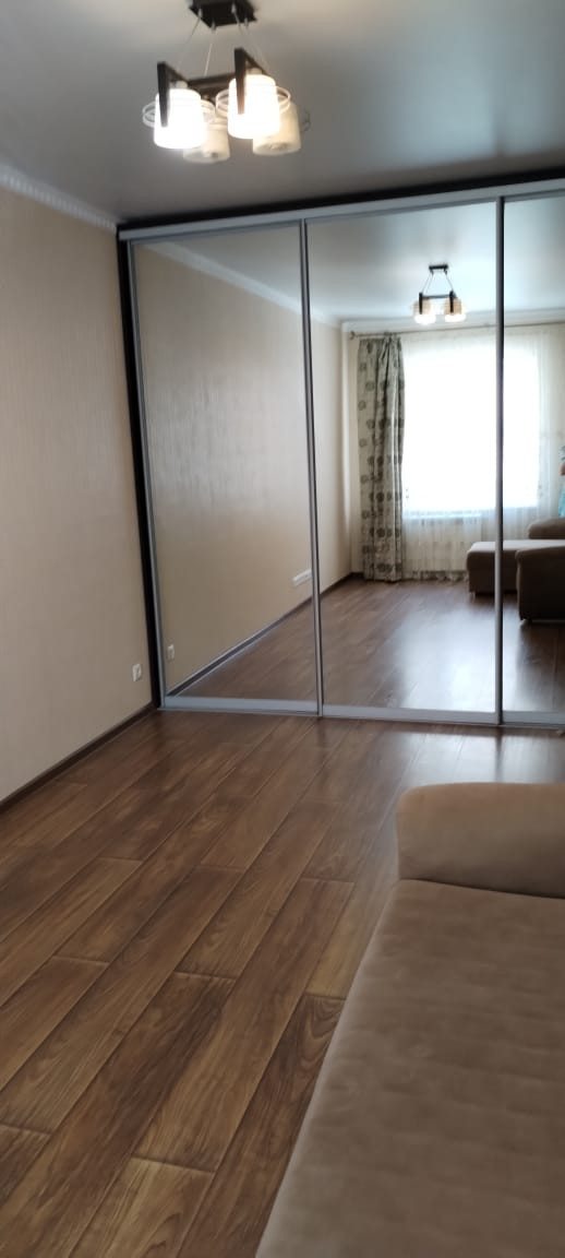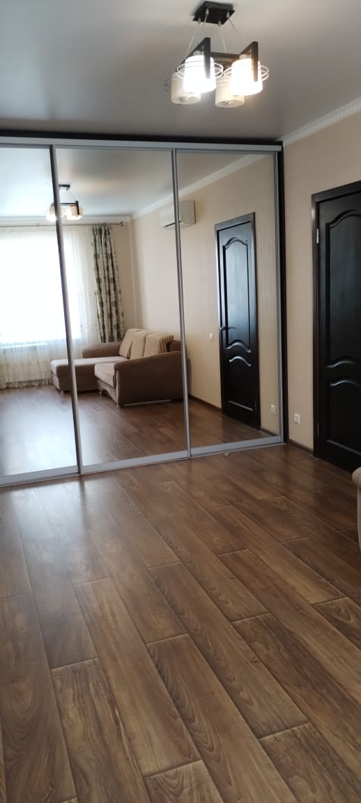 Зеркальный шкаф-купе во всю стену очень вместительный и расширяет пространство.