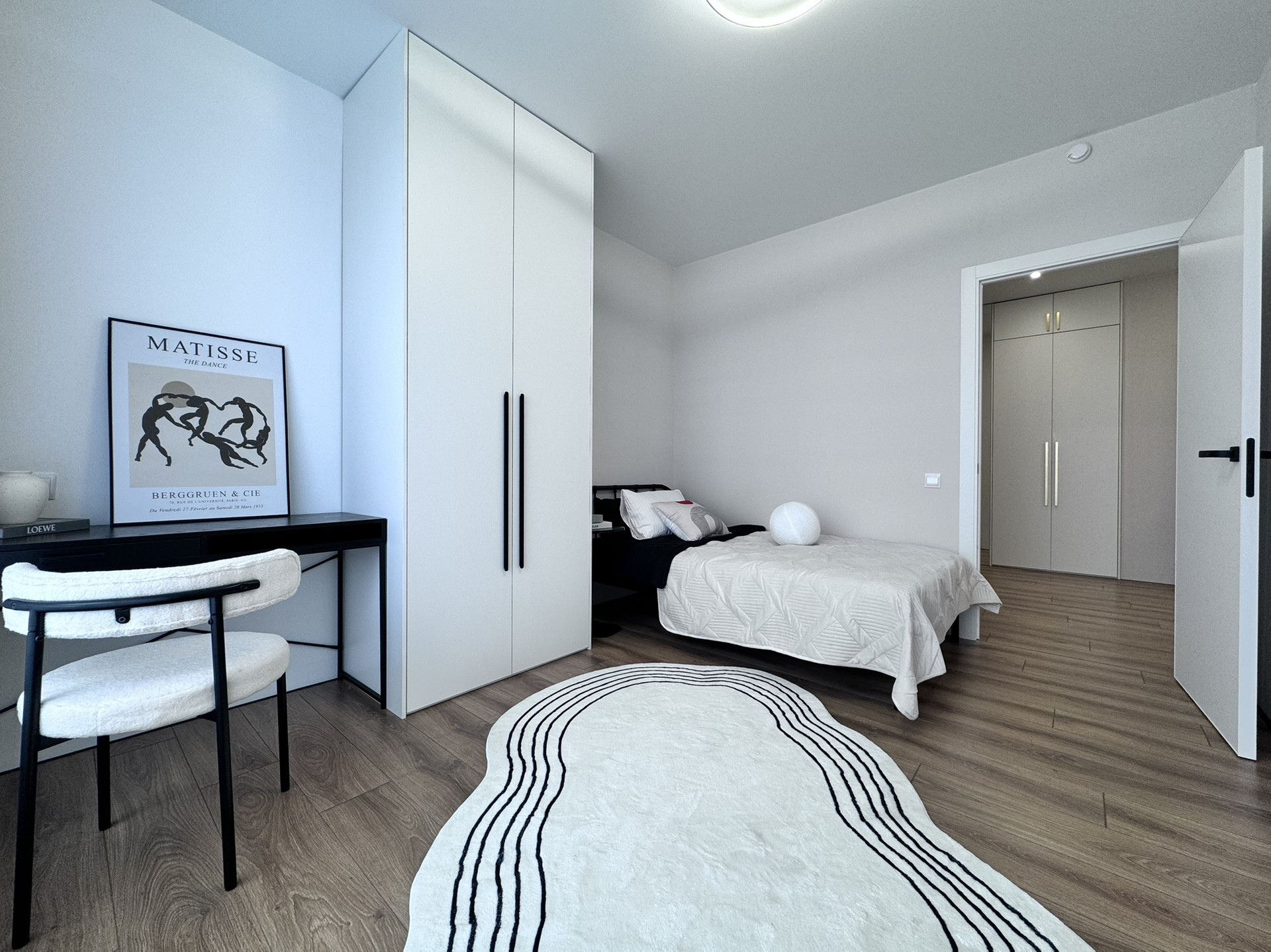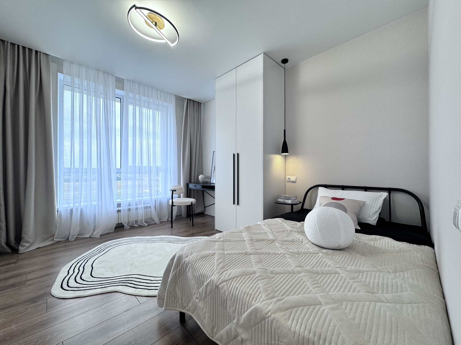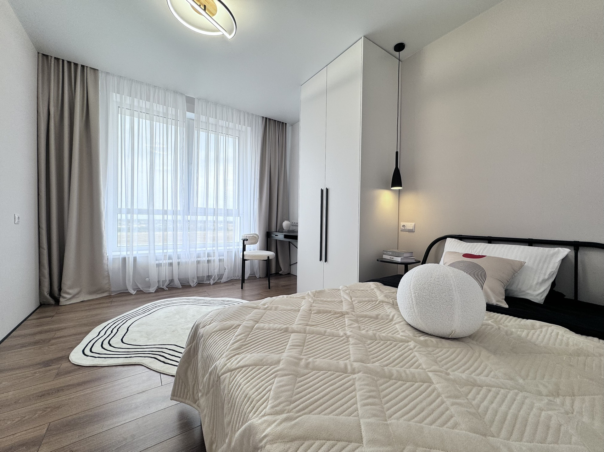 - Спальни: Просторные и уютные, обеспечат комфортный отдых. В родительской комнате встроен столик, стоит двухспальная кровать, с ортопедическим матрасом, а во второй спальне организована удобная зона для учебы или работы