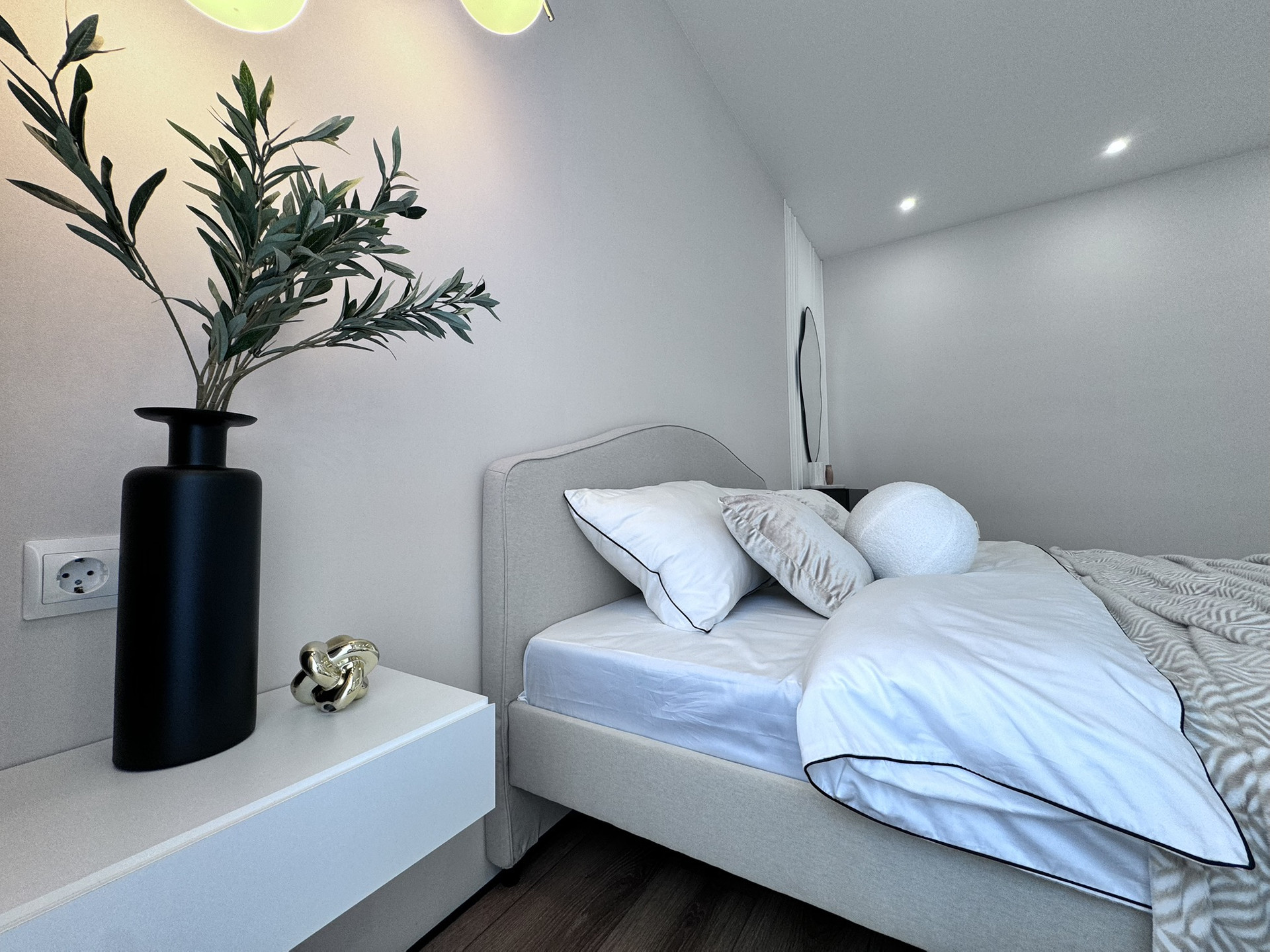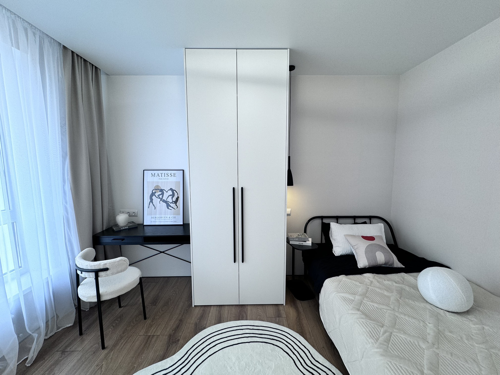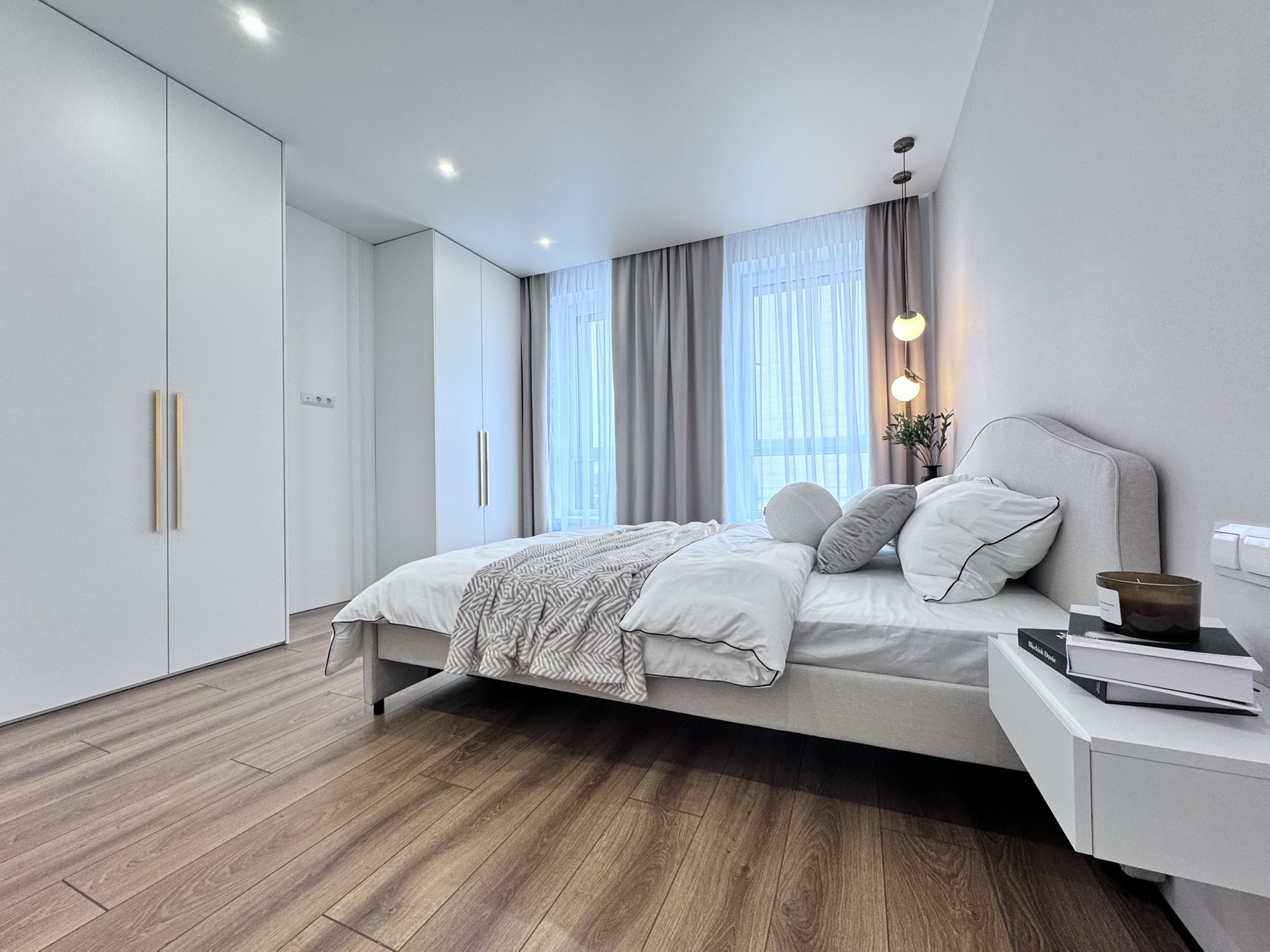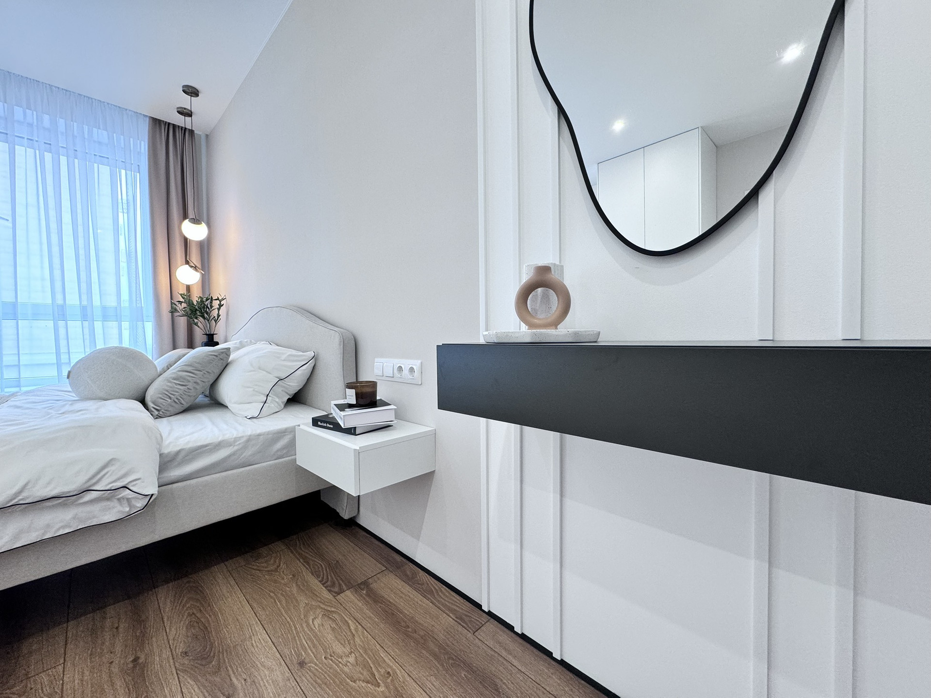 - Спальни: Просторные и уютные, обеспечат комфортный отдых. В родительской комнате встроен столик, стоит двухспальная кровать, с ортопедическим матрасом, а во второй спальне организована удобная зона для учебы или работы