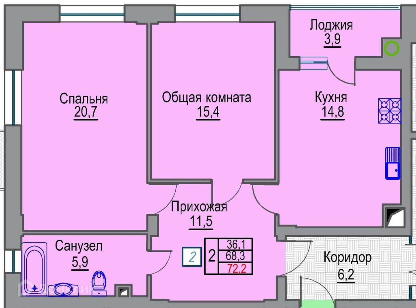 Общая площадь 72.2 м2