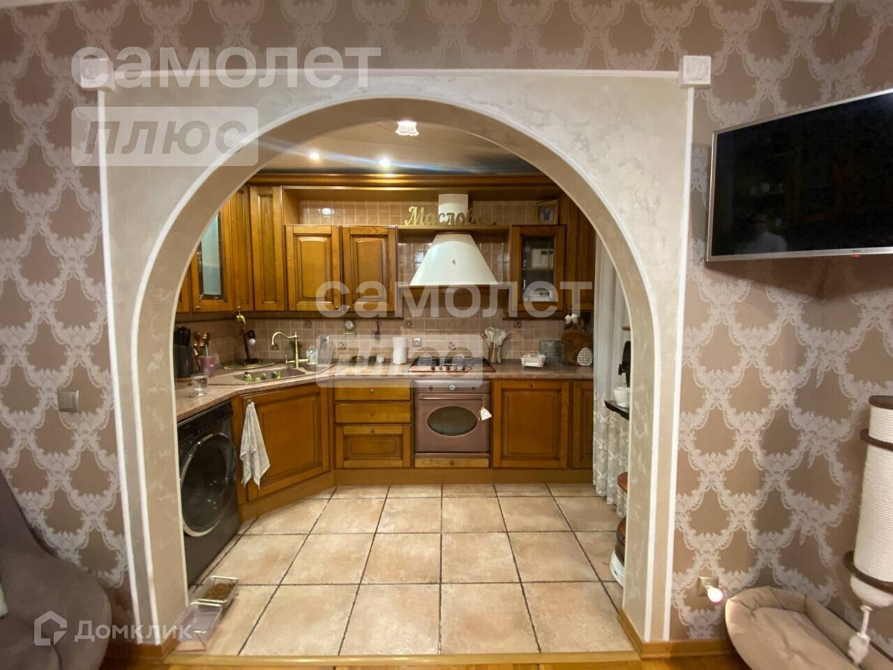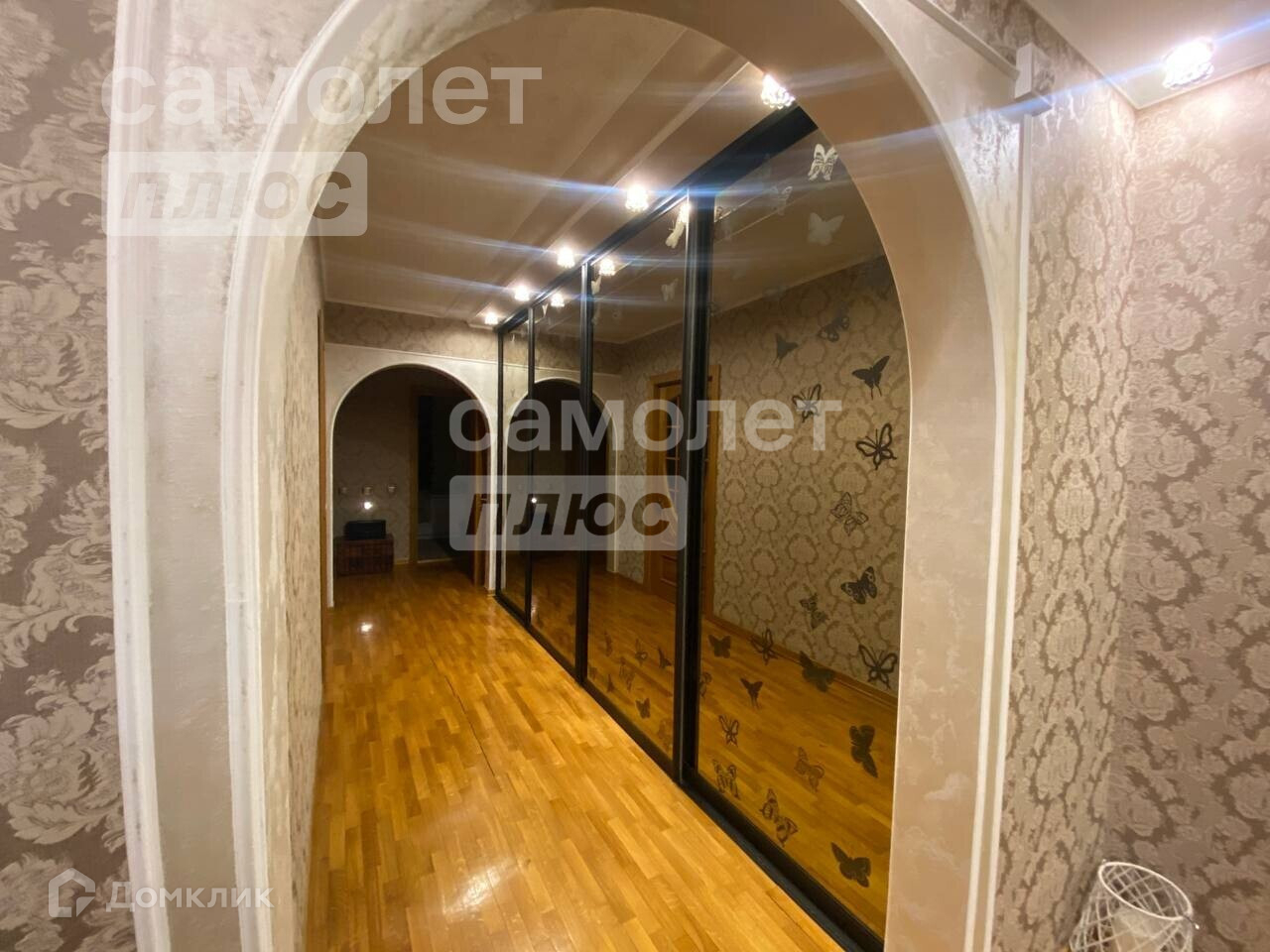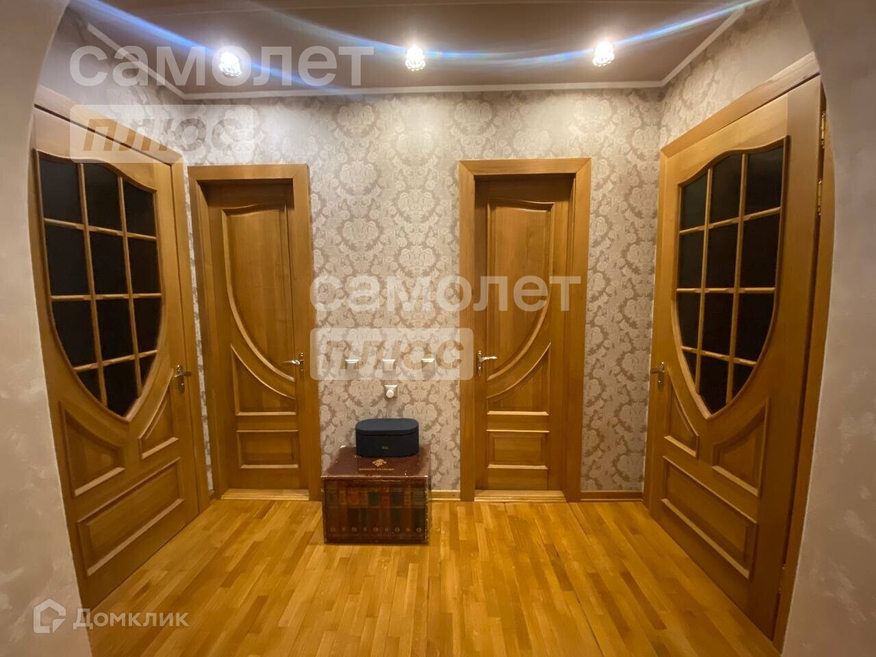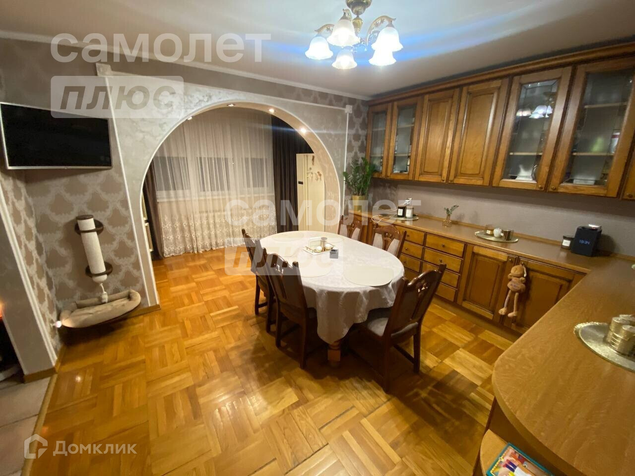 Квартира в идеальном состоянии: на полу постелен паркет, все стены выровнены, поклеены дорогие обои, все двери и кухонный гарнитур из натурального деревянного массива.