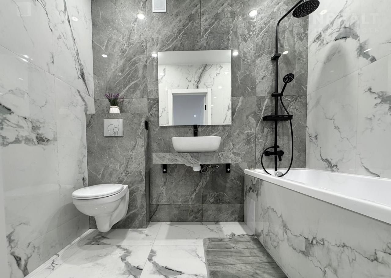 Теплая стена в ванной комнате, для сушки Полотенцев и халатов .Накладная раковина на инсталляции из керамогранита, что делает срок службы на всю жизнь. Инсталляция с подвесным унитазом . Ванна 100% акрил на каркасе ,