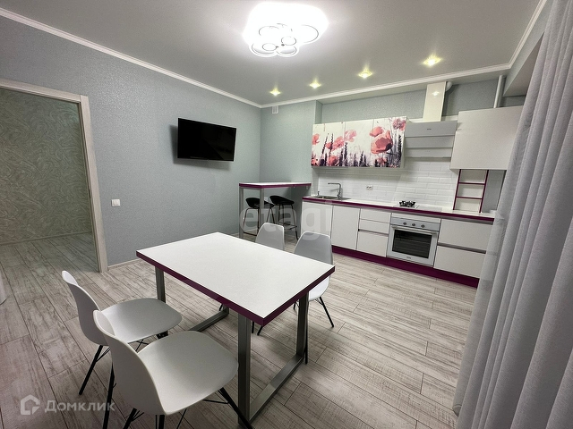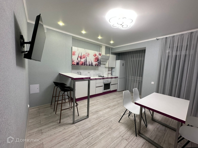 Кухня: Кухонный гарнитур со встроенной техникой, обеденный стол, стулья, барная стойка, холодильник, телевизор, диван.