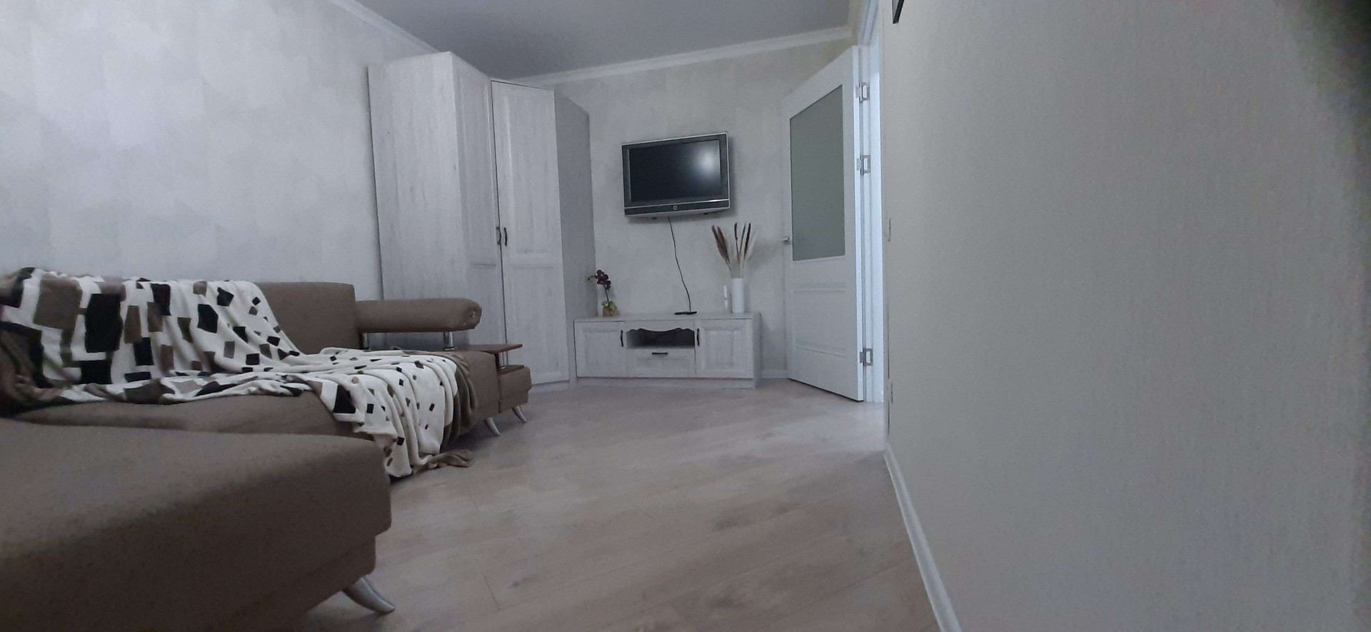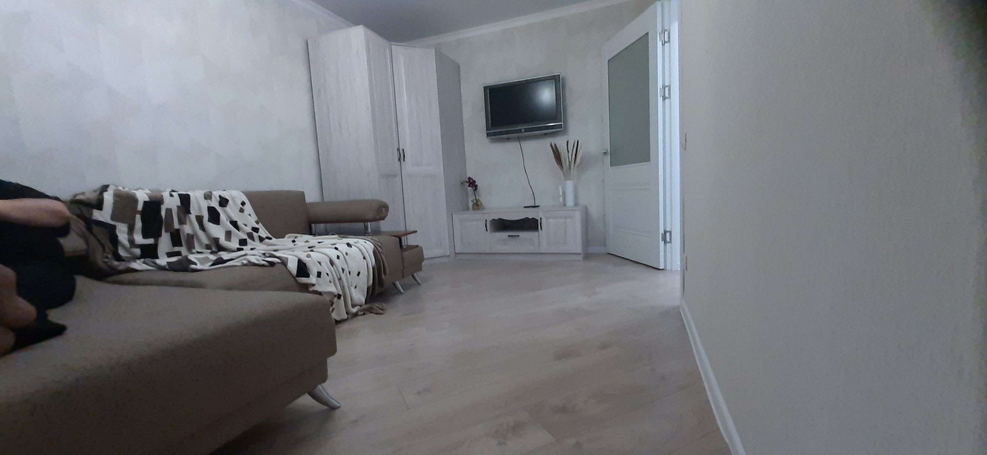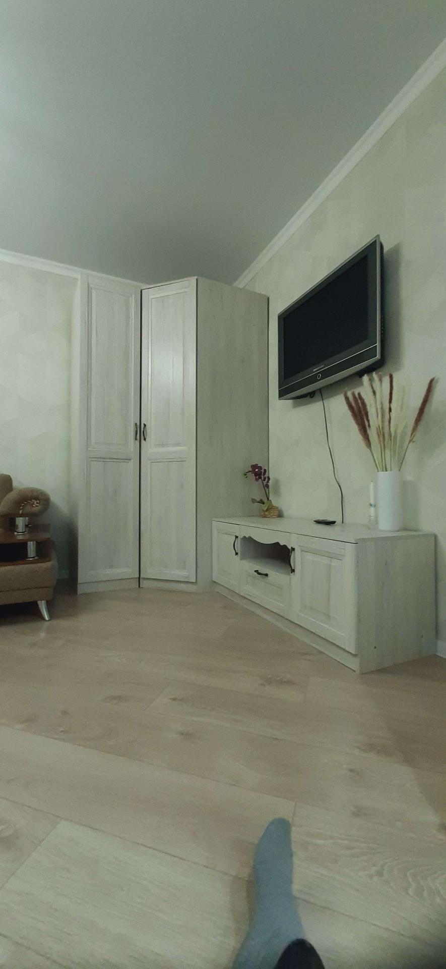 В комнате новые: напольное зеркало, очень вместительный угловой шкаф, шкаф с полками, TV-тумба, стеллаж и стол. Установлен телевизор, очень просторный, раскладывающися, диван.
