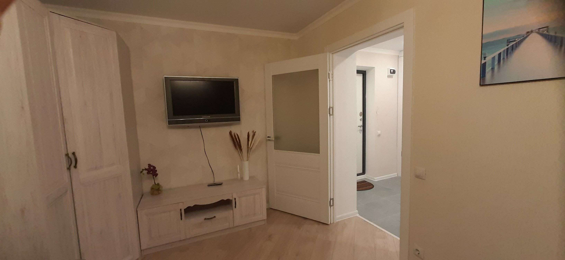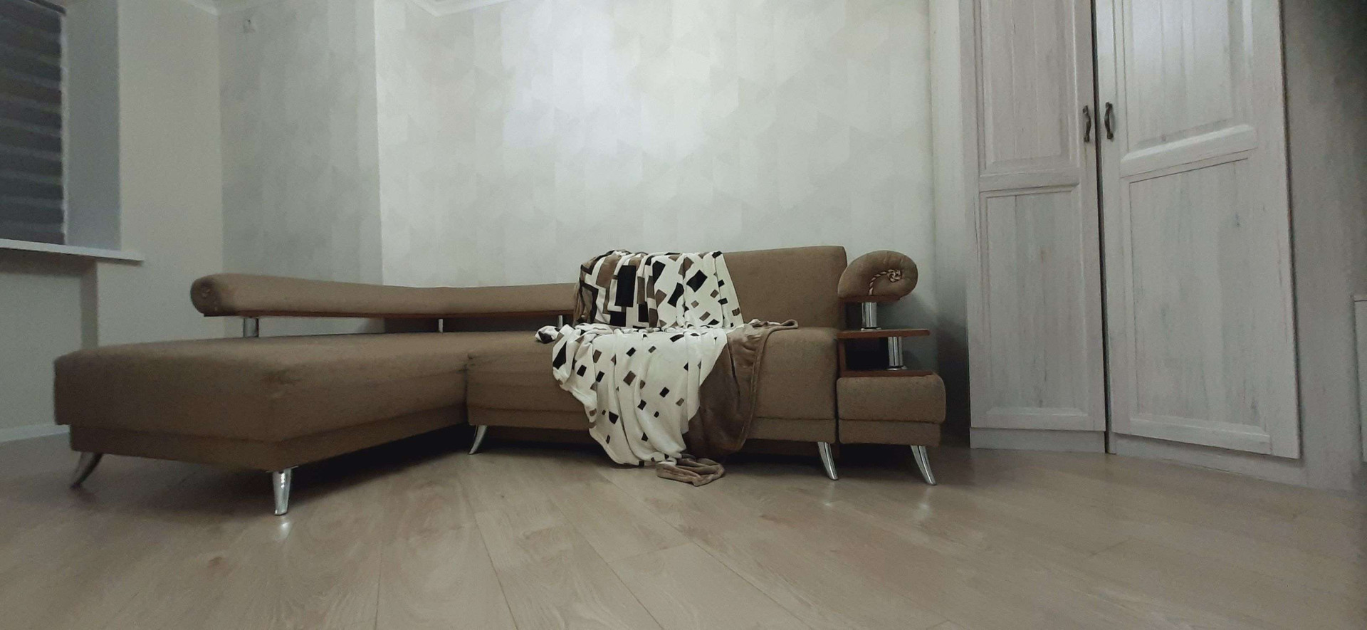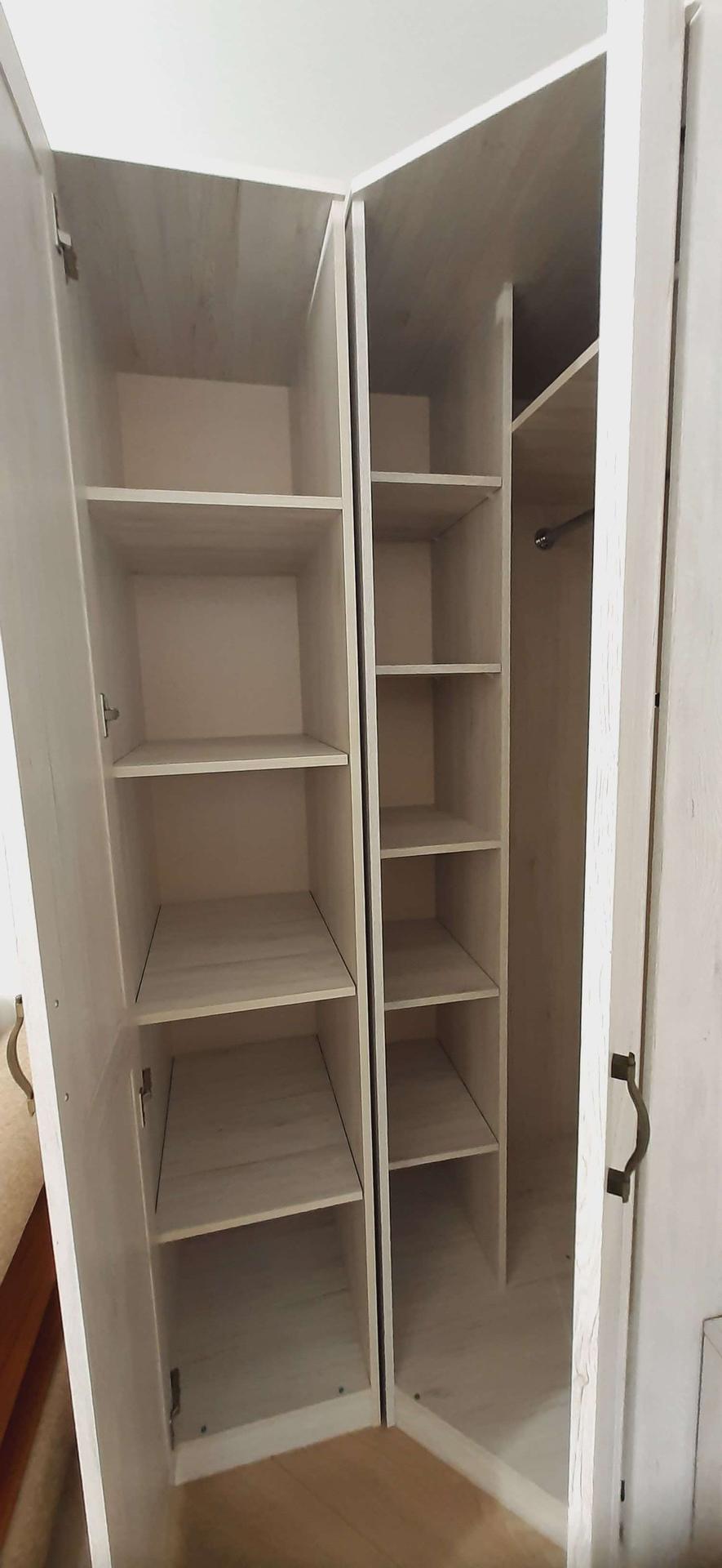 В комнате новые: напольное зеркало, очень вместительный угловой шкаф, шкаф с полками, TV-тумба, стеллаж и стол. Установлен телевизор, очень просторный, раскладывающися, диван.