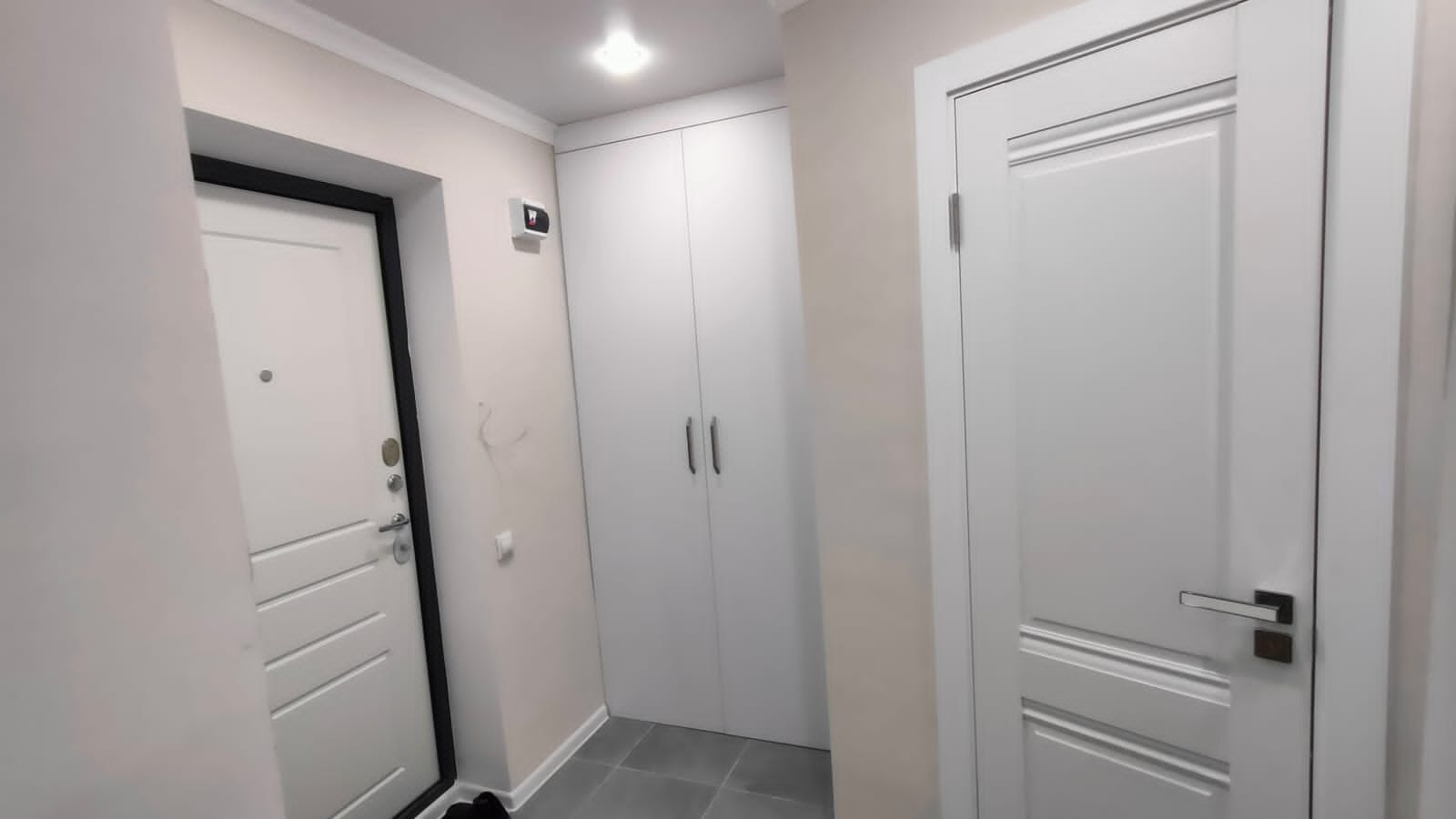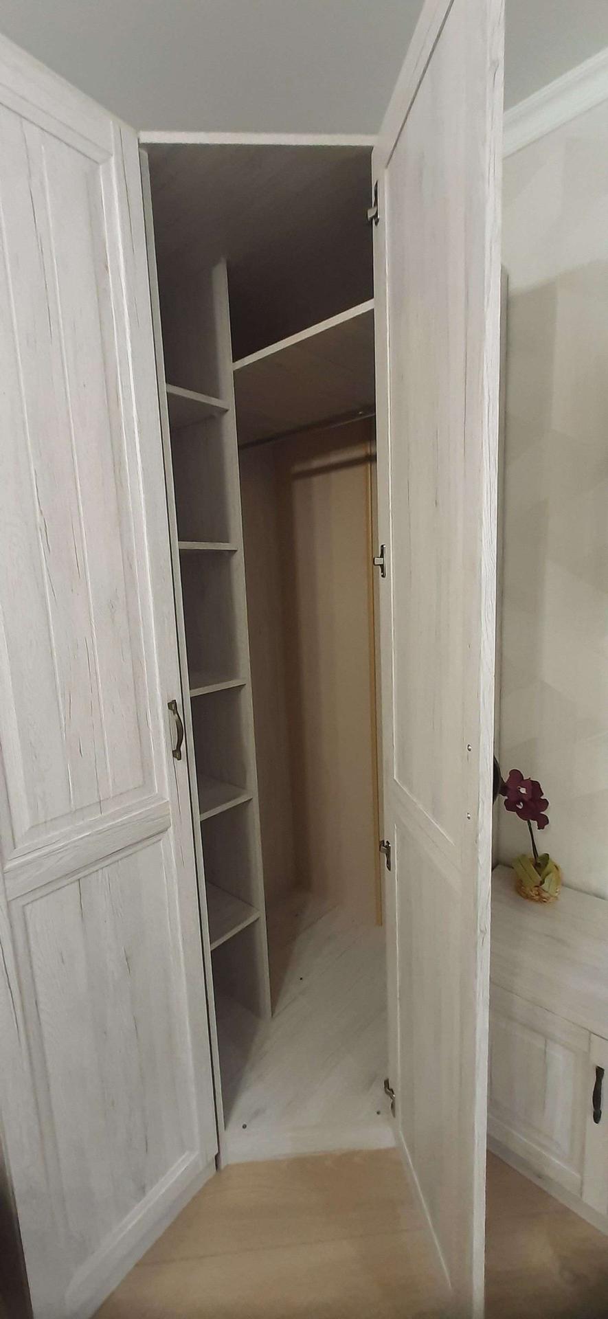 В прихожей шкаф для одежды, система хранения со встроенной стиральной машиной.