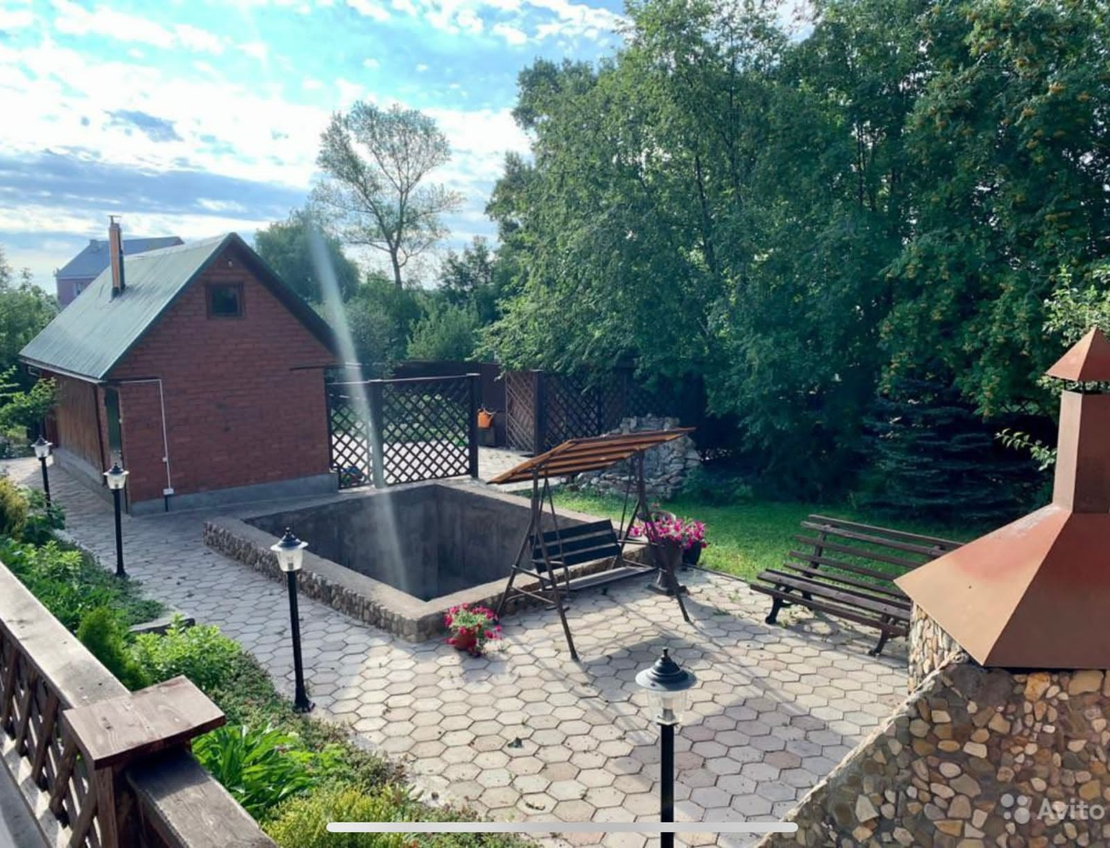 Баня из сруба липы (топиться дровами) облицована красным кирпичом, и перед ней располагается бассейн 3х5