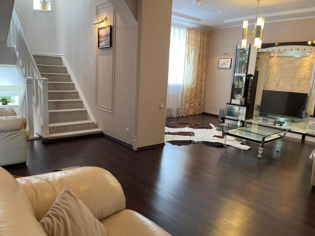 Выполнен хороший качественный ремонт светлых, современных тонах, дорогие обои, установлены качественные межкомнатные двери, по всему дому уложен ламинат, лестница из метала отделанная деревом, ступеньки покрыты ковролином.