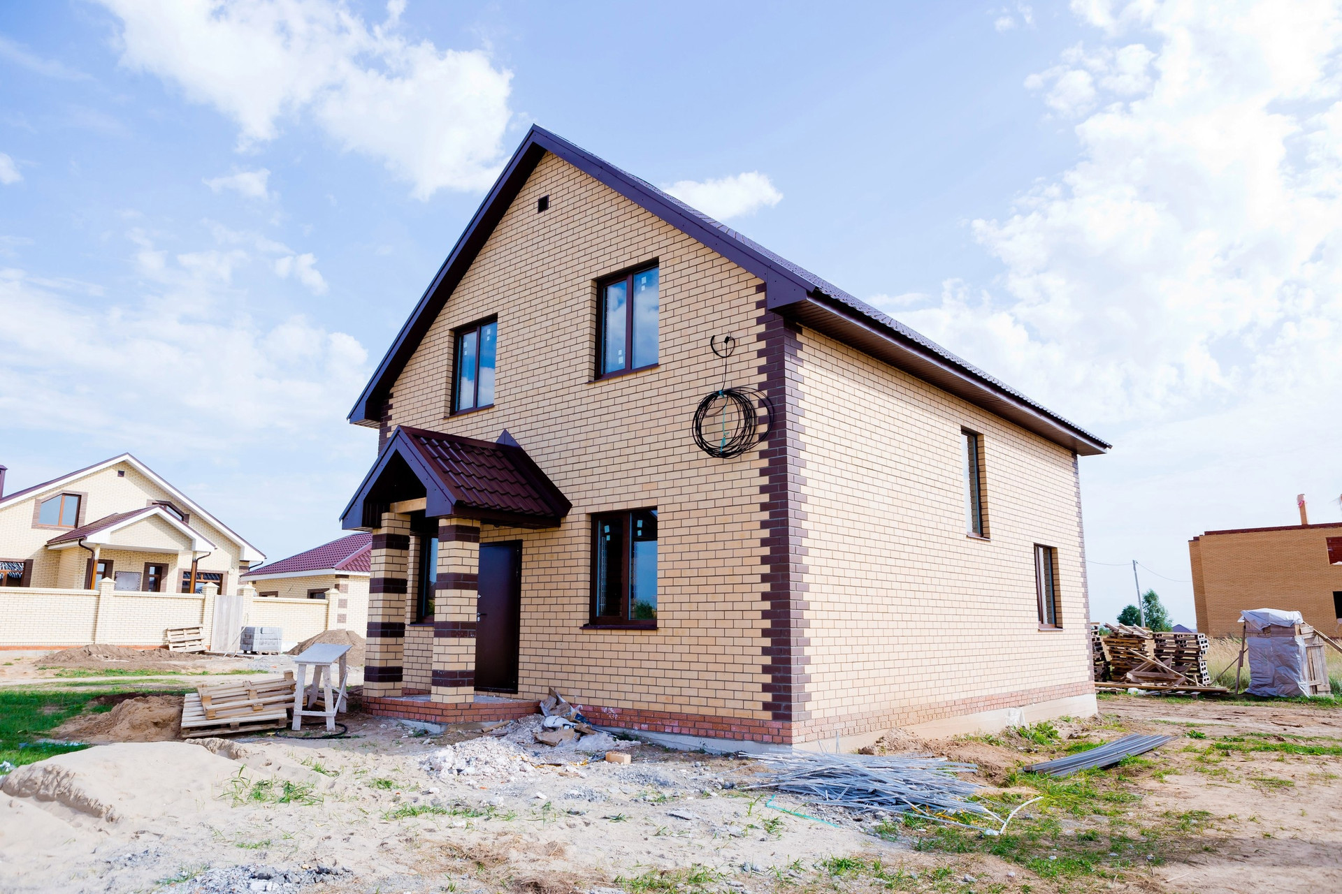 Дом построен из газобетонных блоков 250 мм + утеплитель, вентиляционный зазор и облицовка керамическим кирпичом.
