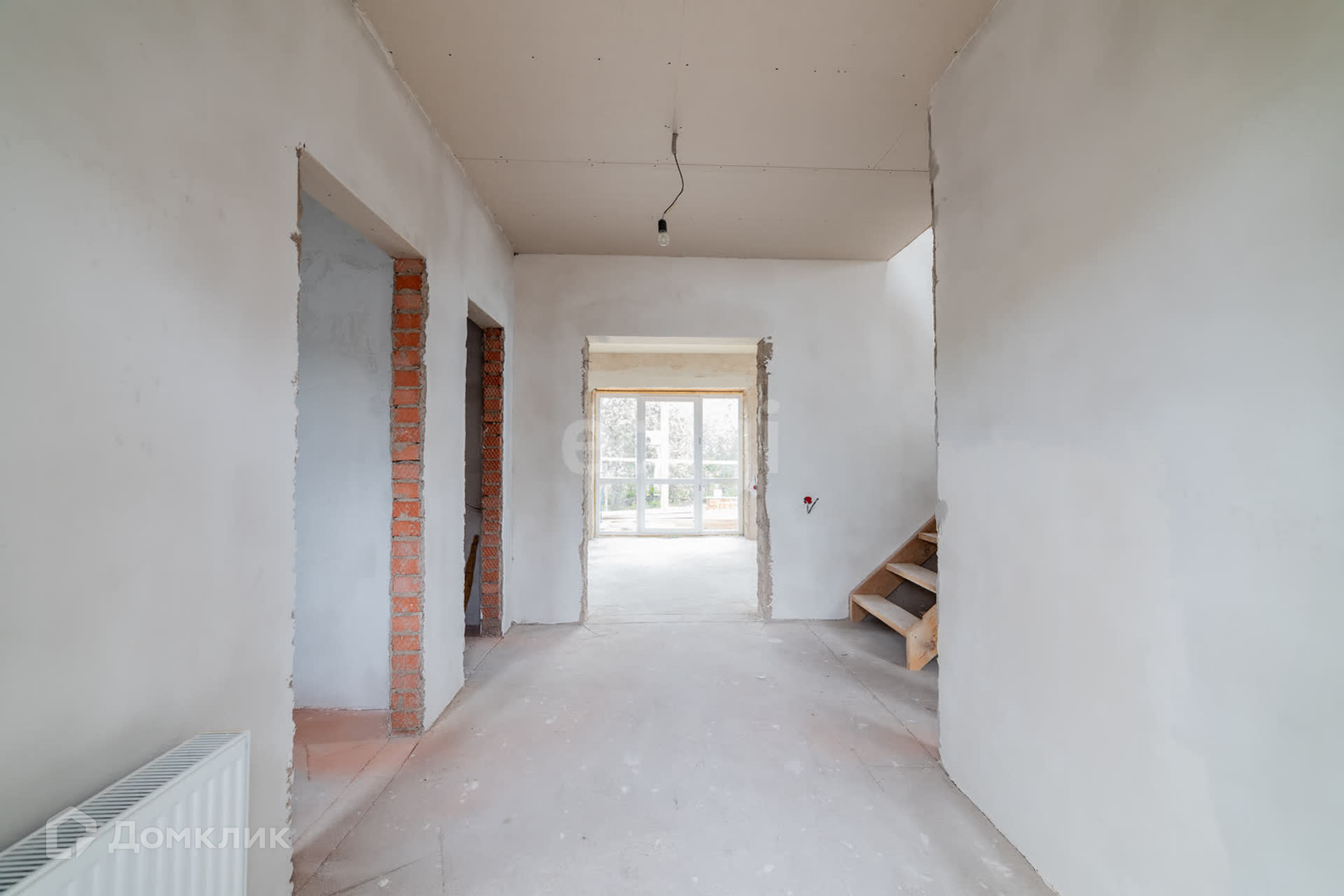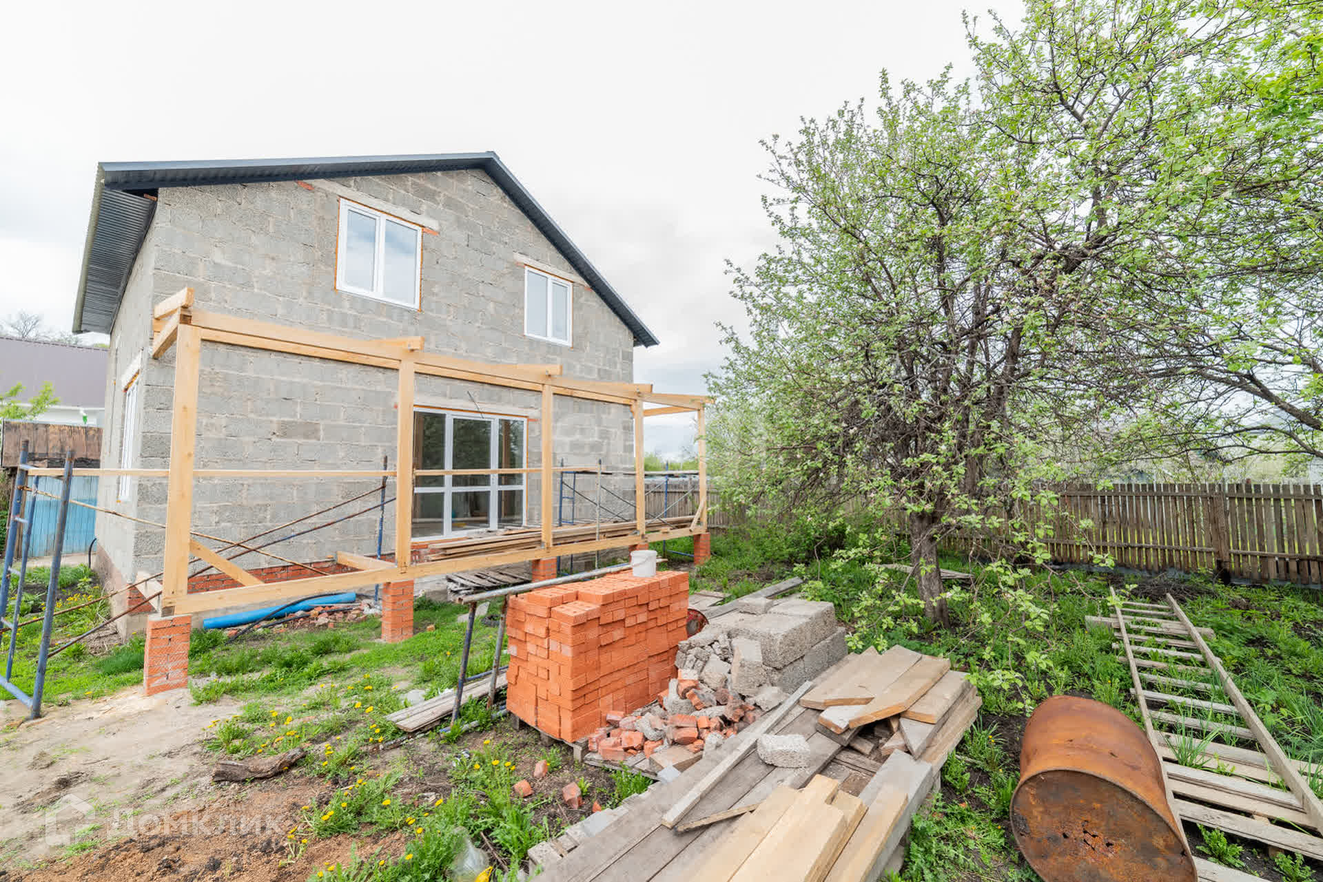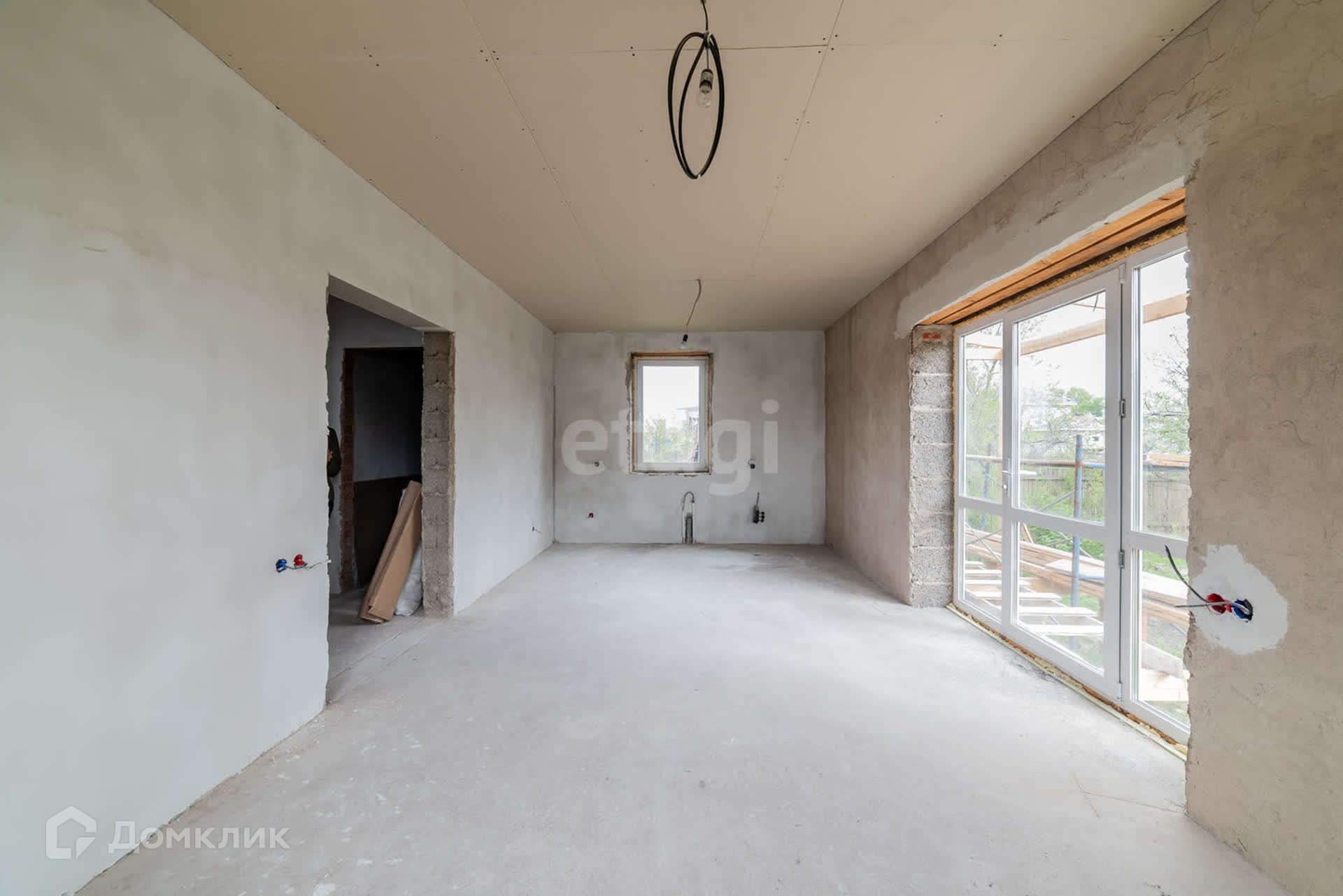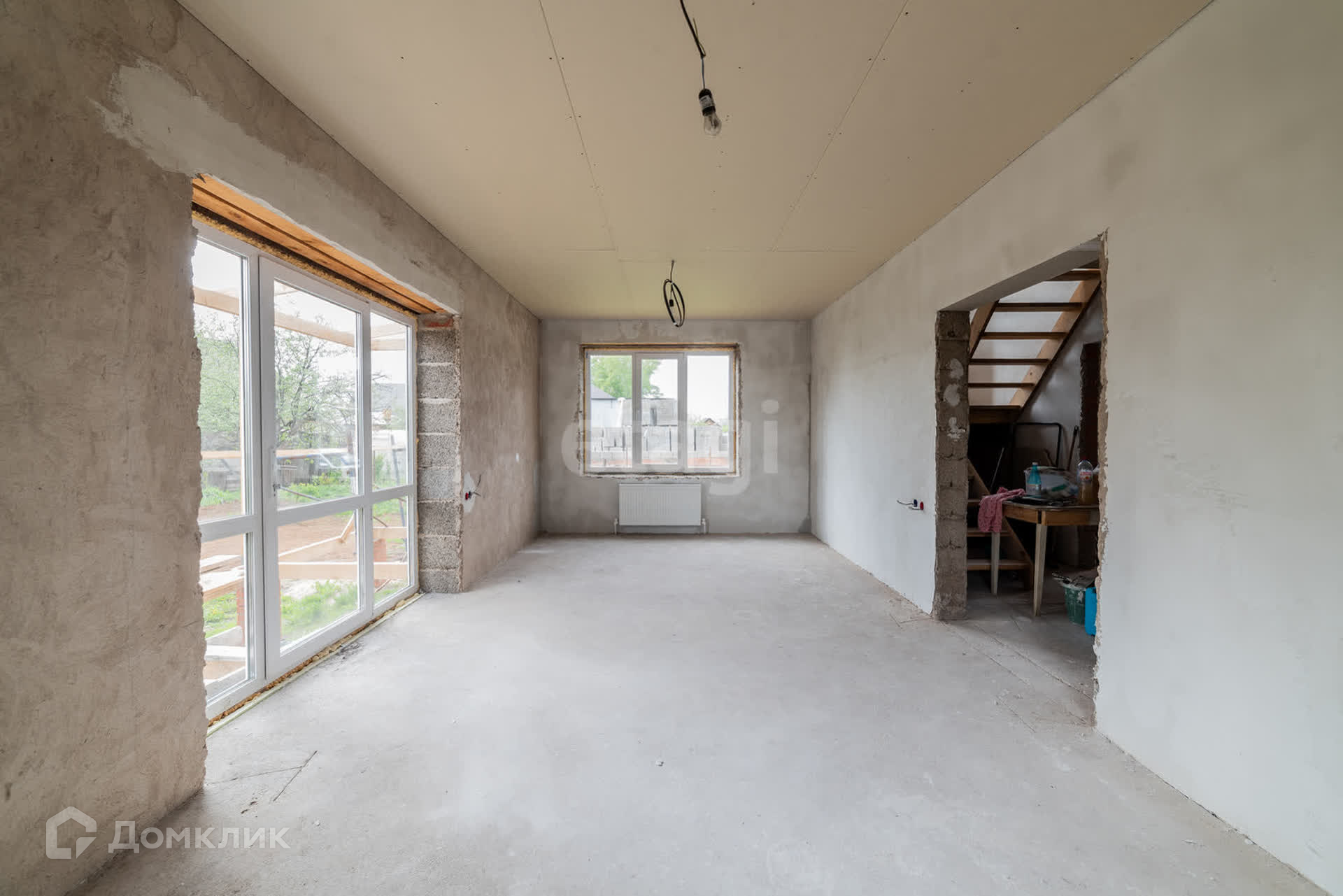 Дом построен из арболита толщиной 40 см, на полу сухая стяжка, полы ровные, потолок везде обшит гипсокартоном, во всем доме установлены пластиковые окна, выход на террасу дома из кухни-гостиной, где установлены панорамные окна, благодаря чему в доме много света.