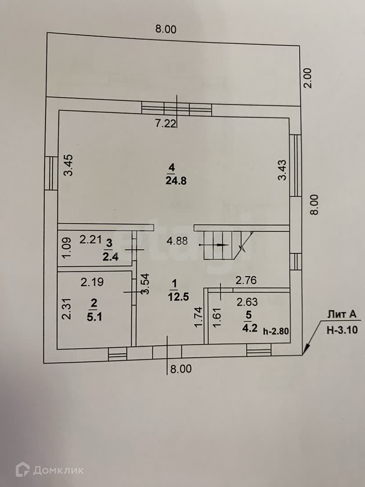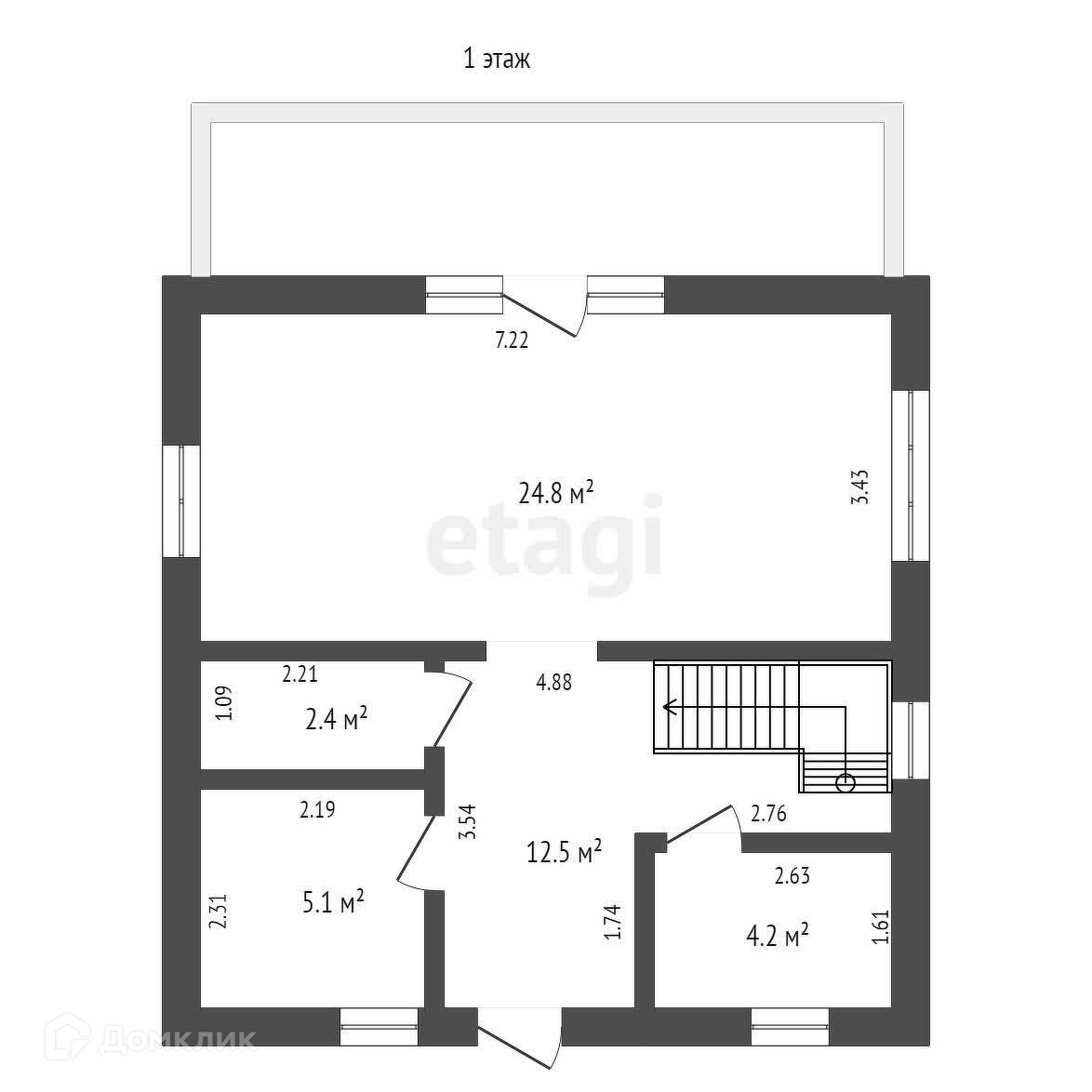 В доме на 1-м этаже находится кухня-гостиная 24,8 кв.м, санузел 5,1 кв.м, гардеробная 4,2 кв.м и бойлерная 2,4 кв.м.