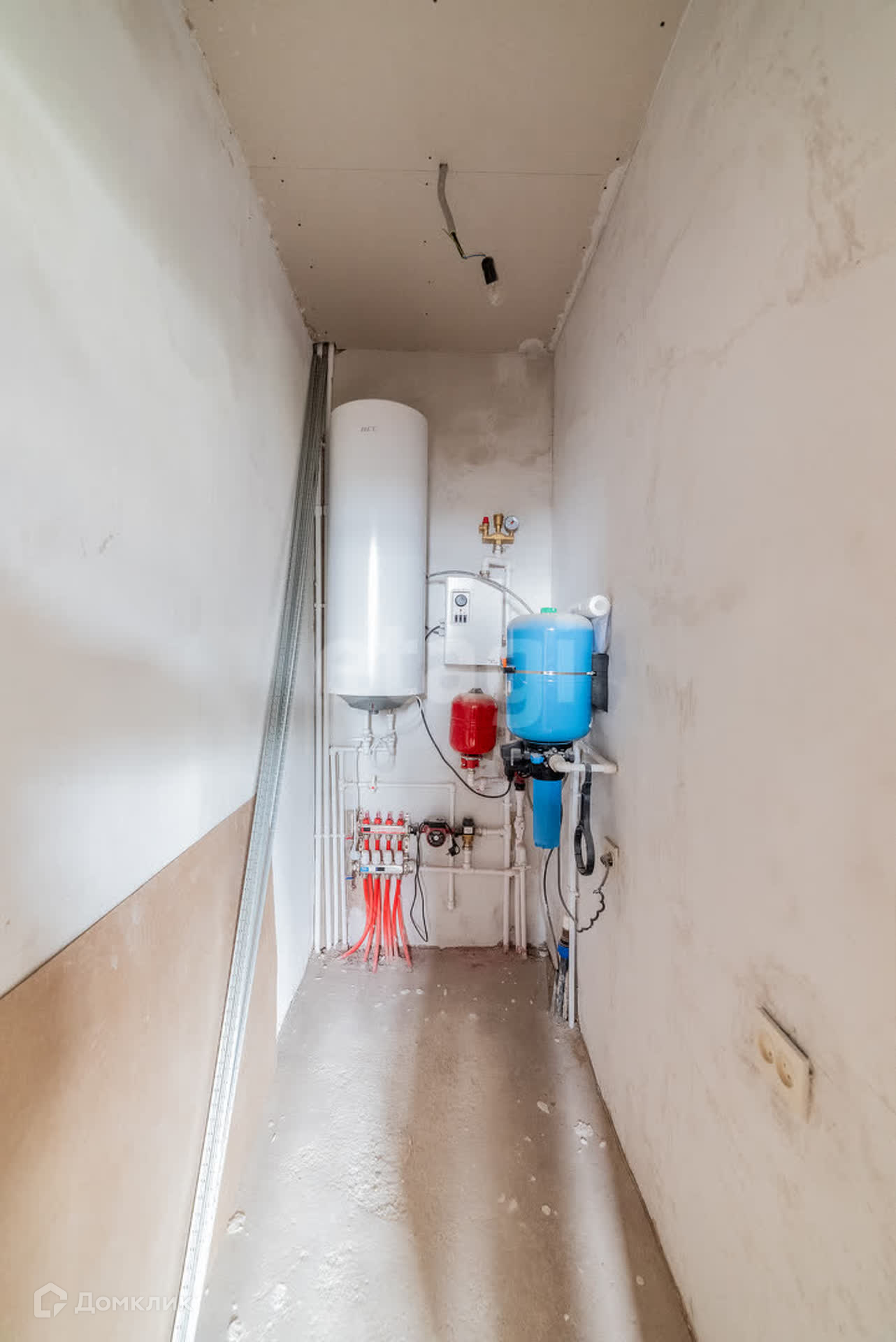 Установлены водонагреватель на 100 л, электрический котел на 12 кВт, водяная станция и расширительный бачок.