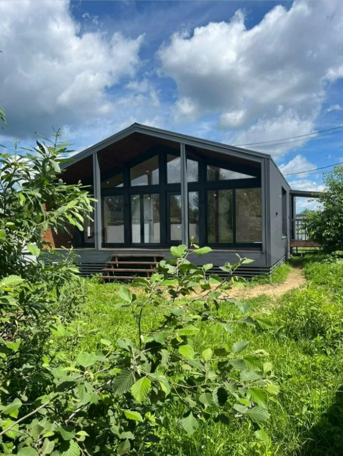 Материал стен деревянный каркас. Располагается уютная кухня-гостиная, комфортные спальные комнаты, гардеробную, небольшую террасу для проведения приятных вечеров.