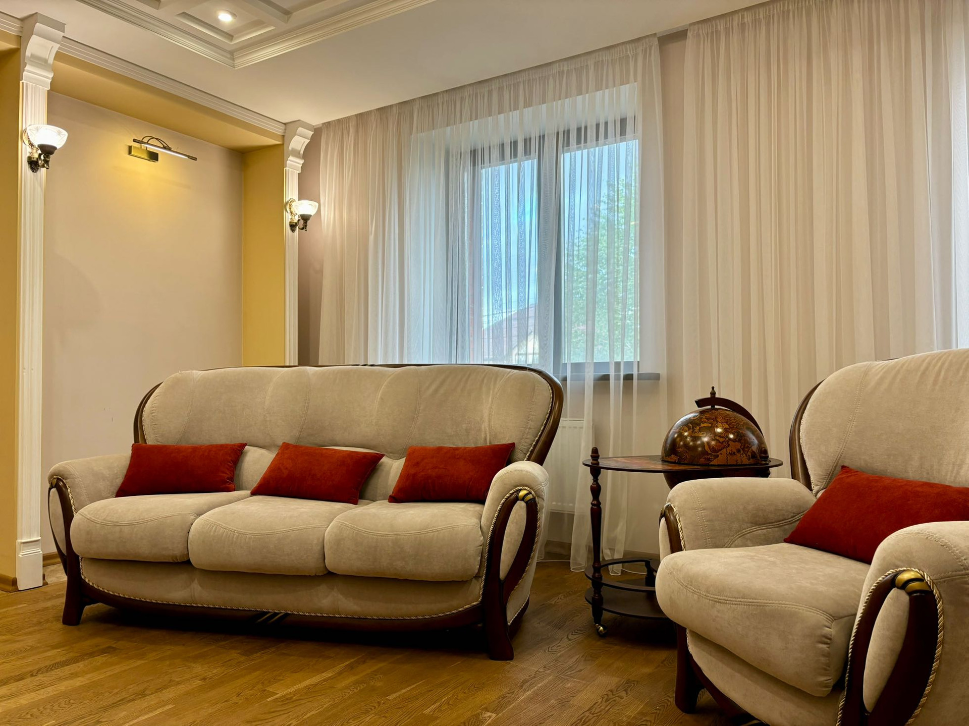 Дом кирпичный, стены 64см. Первый этаж полностью готов к проживанию, натуральный пробковый и дубовый паркет, вся мебель и оконные рамы из массива (это очень качественные материалы,без вредных клеев для детей), кухонный гарнитур от Lorena, варочная панель Bosh, встроенная посудомойка, 2 кондиционера, по всему этажу проведен теплый пол. Гардеробная система ikea.