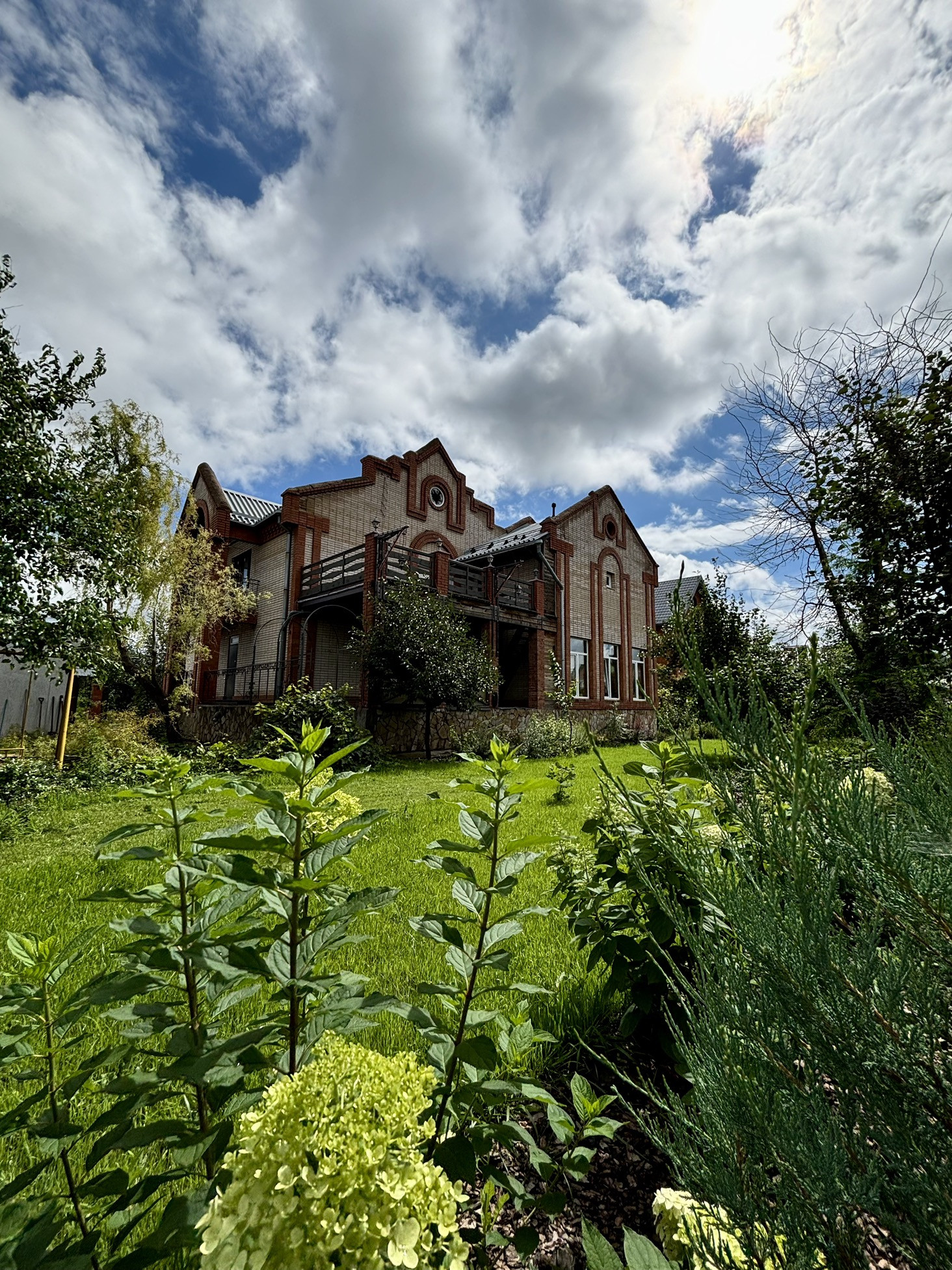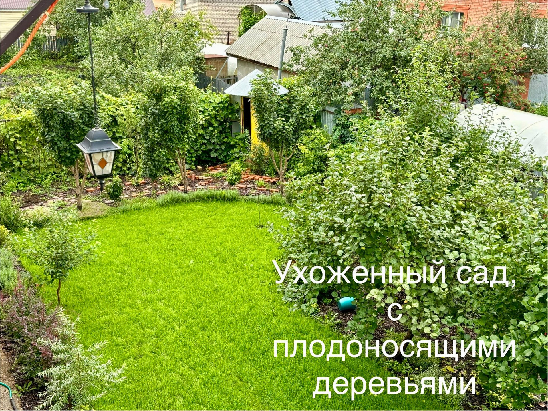 На участке заложен сад , который плодоносит и сочный газон. Стены кирпичные 64 см, и фундамент из бетонных блоков - это очень надежные материалы - летом в доме в прохладно, зимой тепло.