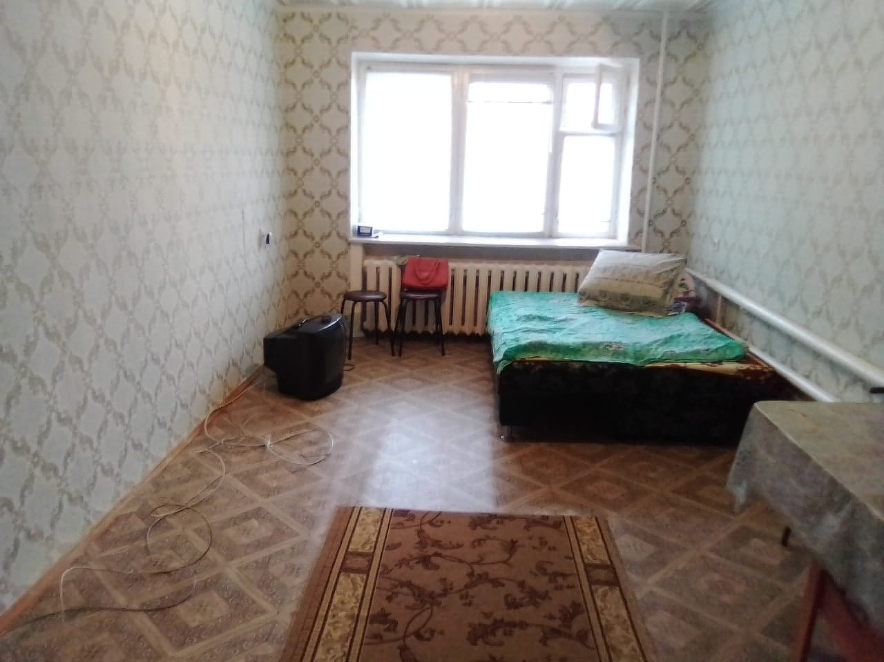Ремонт - косметика, на полу линолеум, потолочная плитка, окно- пластиковое..Есть мокрая точка. Можно провести воду в комнату.