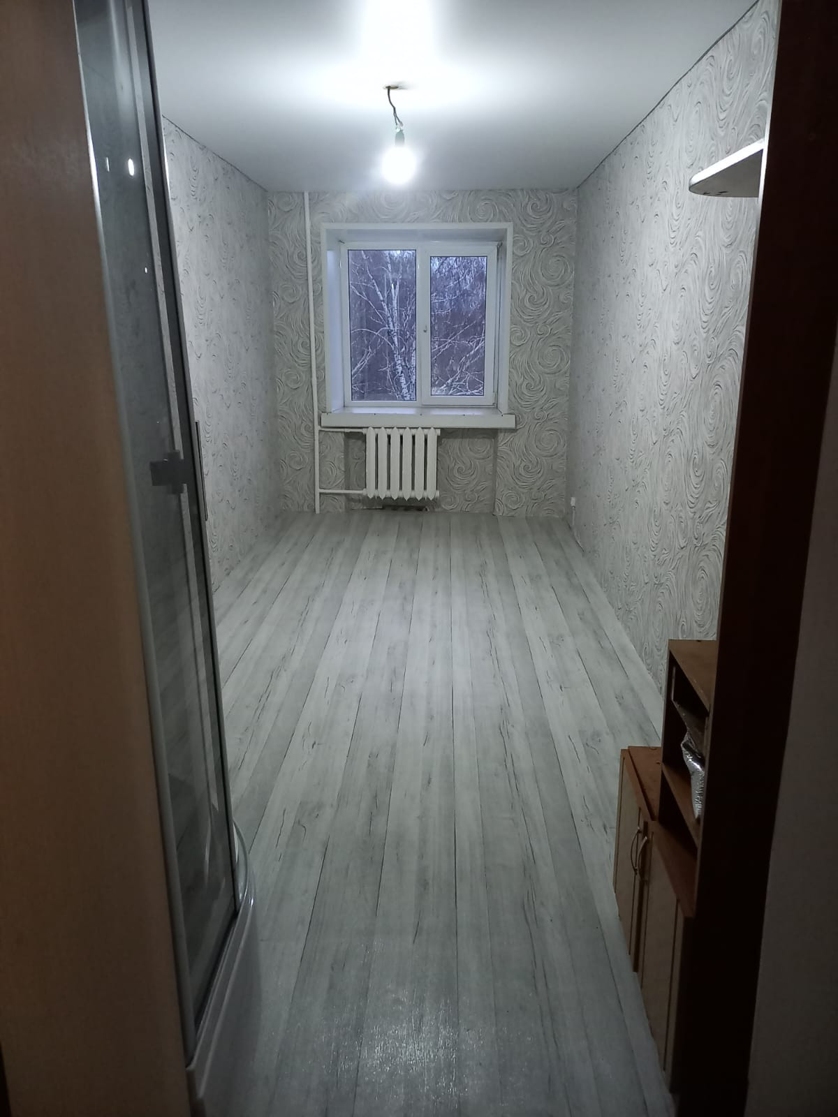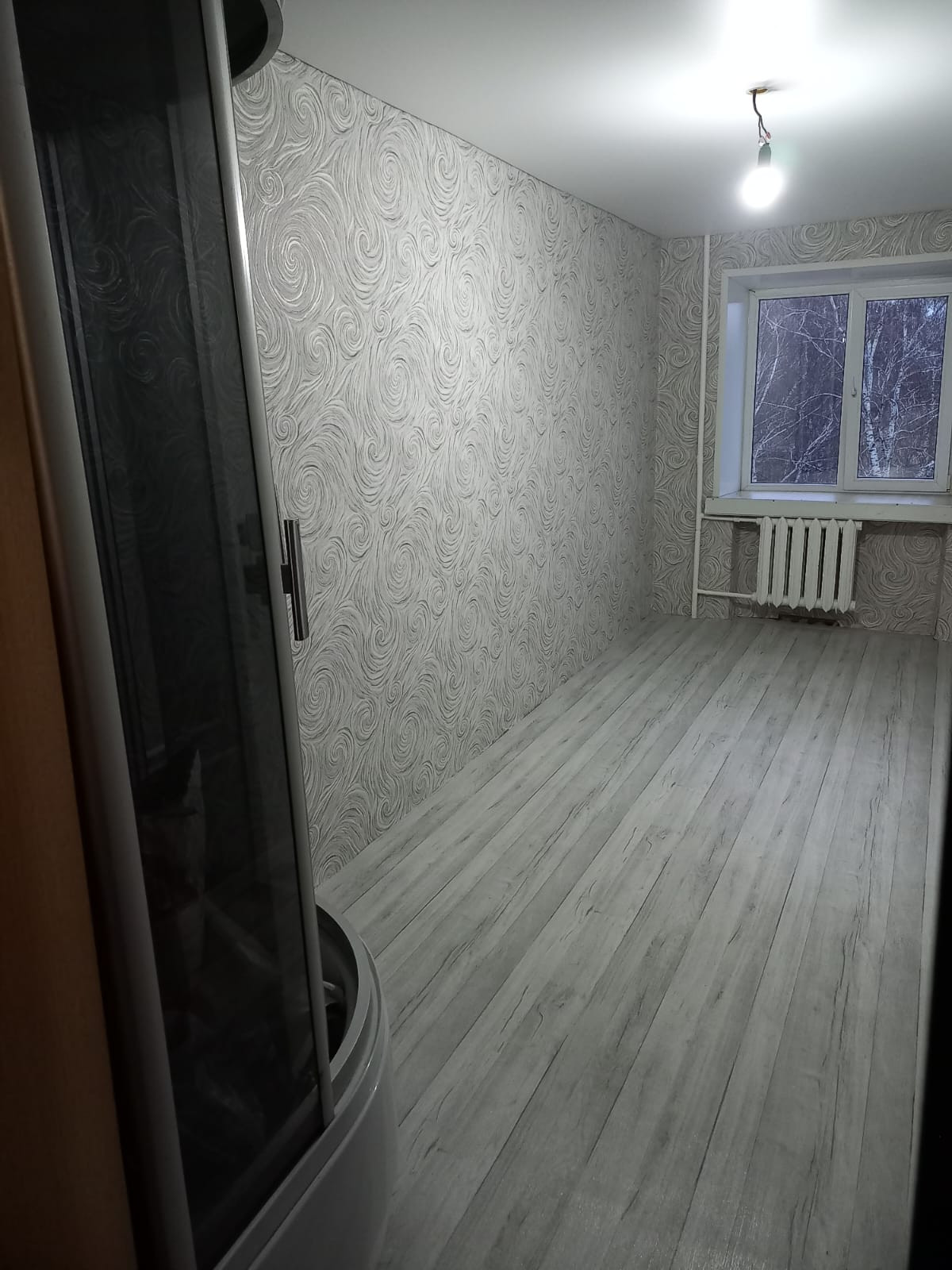 сделан свежий ремонт, душевая кабина,вода в комнате, есть отвод для установки раковины.Документы готовы, можно в ипотеку, материнский капитал рассматриваем.