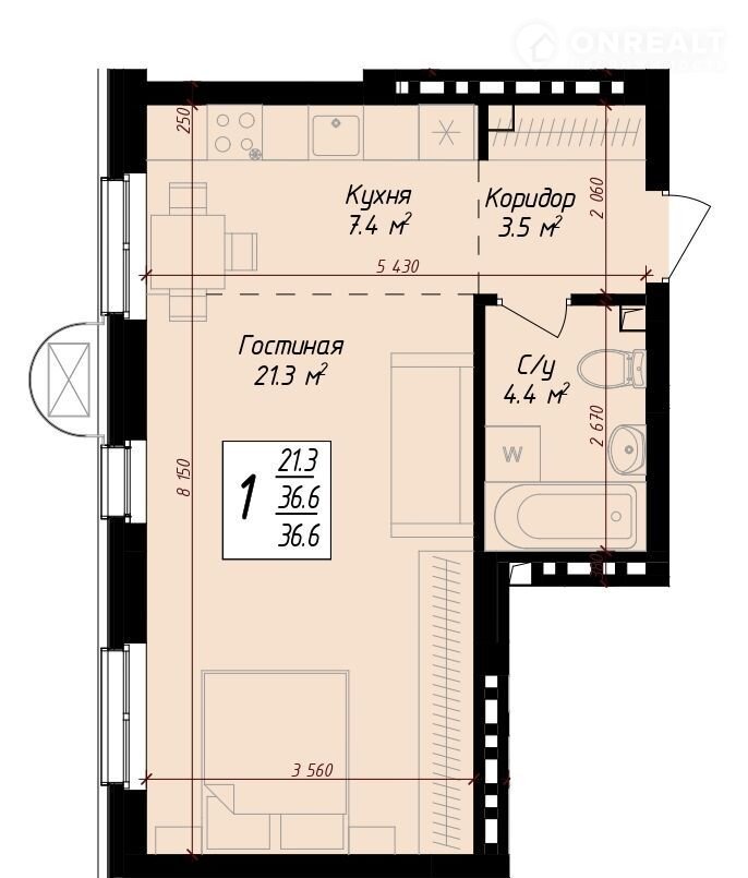 Общая площадь 36.6 м2