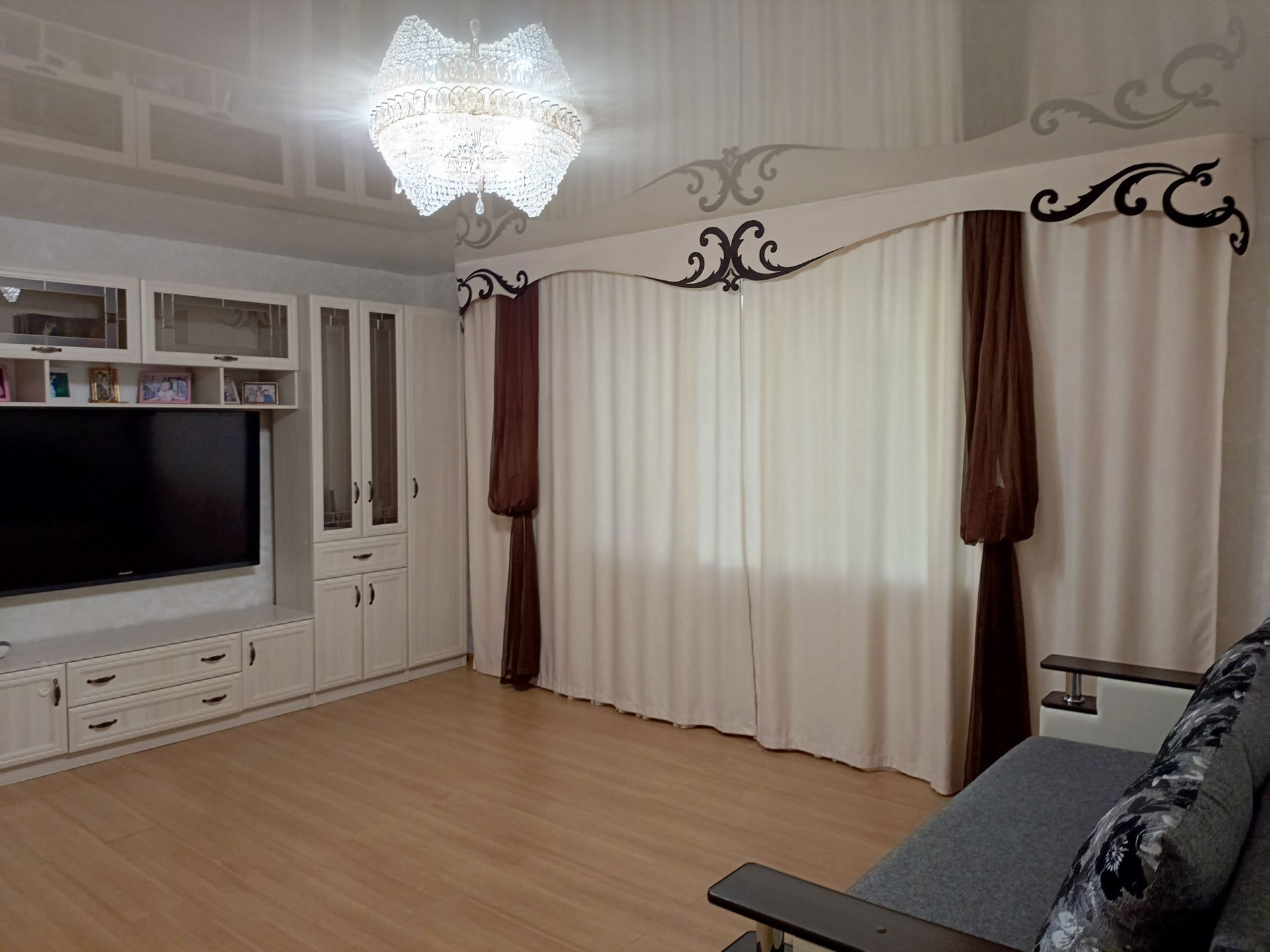 Новым хозяевам оставляю большой угловой  кухонный гарнитур с бытовой  техникой, спальный гарнитур, шикарную мебель в зале и огромный телевизор!